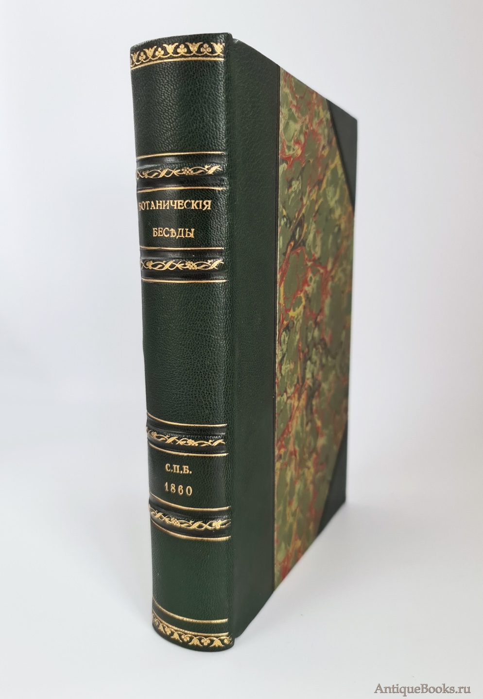 Перевод, в применении к отечественной флоре Бекетовым. [4], 380, XV, [3] стр, 380 ил., 48 л. цветных (вручную раскрашенных акварелью) иллюстраций. В полукожаном "французском" переплете, с тиснением золотом по корешку. Формат: 22,5x16,5см. Книга "Ботанические беседы" переведена с применением к отечественной флоре Бекетовым. Издание знакомит с наукой посредством подробного изучения более 50 германских растений. С 48-ю раскрашенными рисунками и 380 политипажами. Ауэрсвальд, Бернард (1818-1870) - немецкий ботаник. Россмесслер, Эмиль Адольф (1806-1867) - немецкий естествоиспытатель.