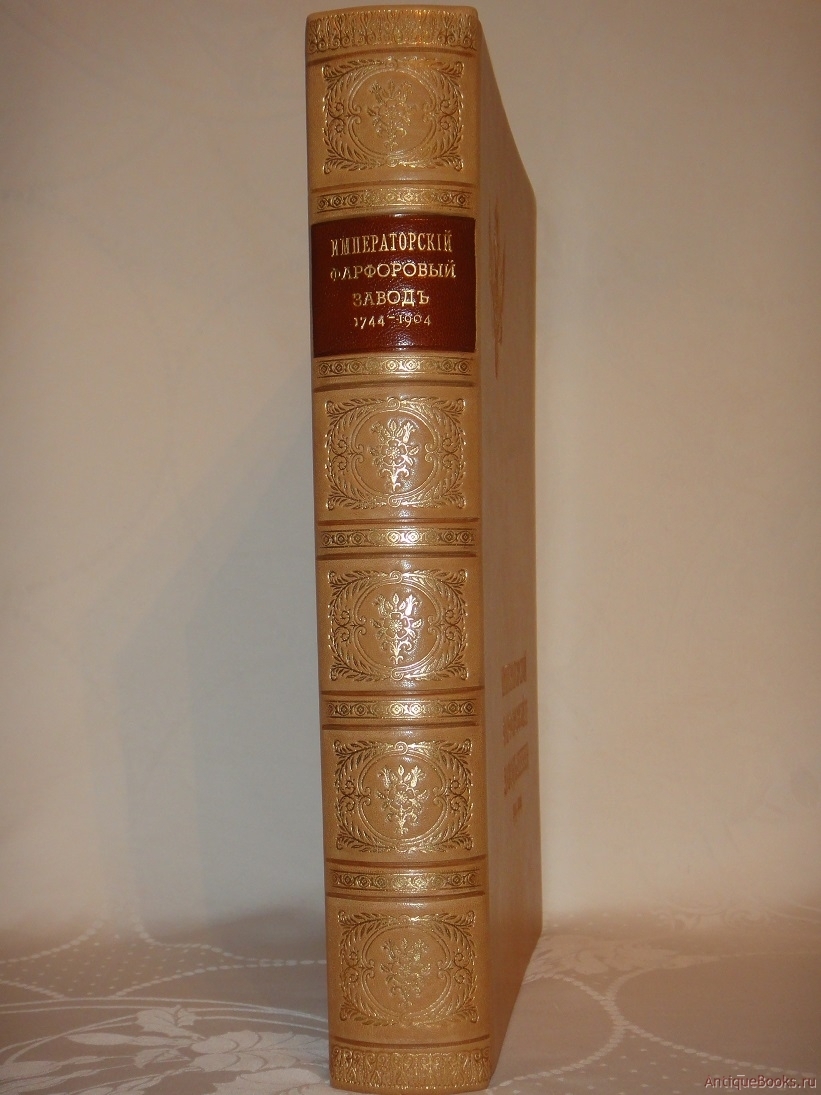 Первое и единственное издание. Представляет несомненную историческую, библиографическую и культурную ценность. Огромный фолиант: 31 * 39,3см.; [VIII], 422, 64 стр. [1] л. фронт., [12] л. иллюстраций. Экземпляр в изумительном по красоте и сохранности современном цельнокожаном переплёте, выполненном в лучших традициях переплётного искусства XIX-XX веков. Круглёный корешок украшен пятью декоративными бинтами, контрастной тёмно-вишнёвой вставкой и глубоким золотым художественным тиснением. На передней крышке название издания под золотым двуглавым орлом: Императорскiй Фарфоровый Заводъ. 1744-1904. Золотая английская головка, торшонированный обрез. Оригинальные с разводами муаровые форзацы, золотая узорная дублюра, шёлковое ляссе. Книга напечатана на плотной дорогой высококачественной мелованной бумаге и украшена многочисленными текстовыми фототипиями и 12-ью полностраничными таблицами, выполненными в технике гелиогравюры. На гравированном фронтисписе изображён бюст Императрицы Екатерины II; одна специальная вклейка, с изображениями марок фарфора, выполнена в технике хромолитографии в типографии Товарищества Р.Голике и А.Вильборг. Все полностраничные иллюстрации проложены защитными матовыми кальками с поясняющими надписями на русском и французском языках. Под переплётом сохранены мягкие двухцветные рифлёные издательские обложки. Роскошное юбилейное издание, посвящённое 160-летию одного из старейших в Европе Императорского фарфорового завода. Книга была подготовлена группой историков под руководством директора завода, крупного чиновника придворного ведомства - барона Николая Борисовича фон-Вольфа ( 1866-1940 ) и охватывает историю завода от зарождения русского фарфорового производства до первых лет XX века. Для исследований, коллекционеров, и любителей русского фарфора ценность вышедшей книги заключается в том, что она снабжена богатым справочным материалом, выписками из архивных документов, а также изображением более 5000 экспонатов, многие из которых публикуются впервые, из крупнейших музеев России и частных собраний, с подробными аннотациями и комментариями. Материал в книге структурирован по периодам правления Российских Императоров, т.к. за исключением сравнительно небольших промежутков времени вся продукция фарфорового завода предназначалась исключительно для нужд Двора Его Императорского Величества. Императорский Фарфоровый завод основан в 1744 году в Петербурге по Указу дочери Петра Великого Императрицы Елизаветы Петровны. Императорский фарфоровый завод - феноменальное явление в русской художественной культуре. Его продукция - художественный фарфор - является первым фарфором России, как по времени своего возникновения, так и значительному вкладу в Российскую и мировую культуру. Изготавливались все виды фарфоровых изделий - посуда, скульптура, вазы, часы, столы, канделябры и т.д. В конце XIX - начале ХХ века техническое качество изделий было безупречным, а по разнообразию способов обработки и декорирования фарфора завод занимал одно из первых мест в мире. С 1917 года - Государственный фарфоровый завод. С 1925 года - Фарфоровый завод им. М.В.Ломоносова. Красивейшее и редчайшее издание безукоризненной сохранности.