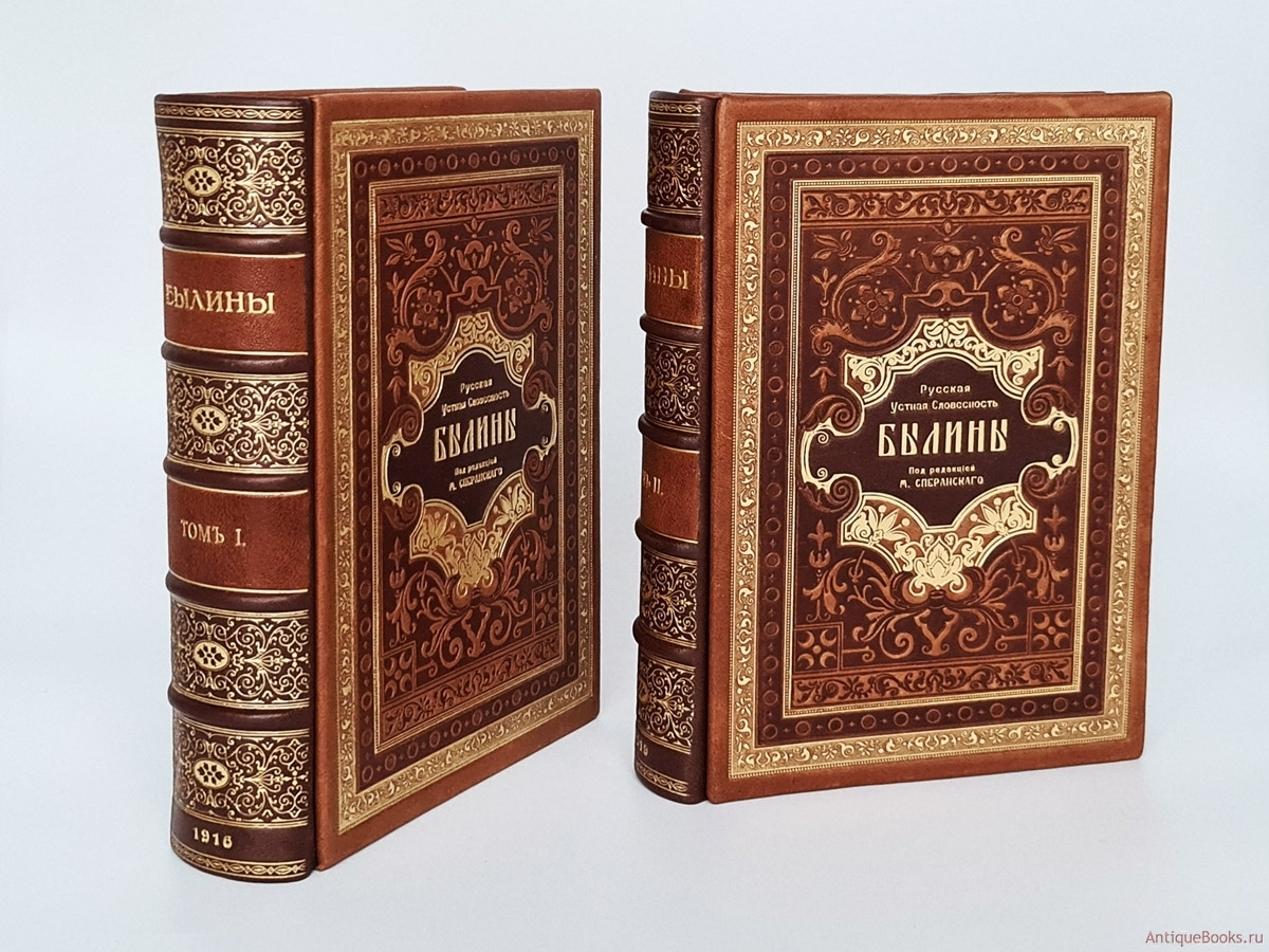 Редкое издание русских былин в двух томах. Первый том вышел в свет в 1916 году, второй только через два года после революции в 1919 году. Т.1: 453 стр., т.2: 585 стр. Формат: 22.5x16 см. С сохранением оригинальных мягких издательских обложек, в которых книги хранились более 100 лет. Чтобы книги и далее сохранили коллекционный вид они оформлены в красивые современные цельнокожаные переплеты из высококачественной кожи. Орнаментальные рамки в русском стиле тиснены золотым и блинтовым тиснением на крышках переплета. Красивые форзацы "павлинье перо". Издание содержит множество иллюстраций. Очень интересный труд, редко встречается в хорошем виде. Отличная сохранность.