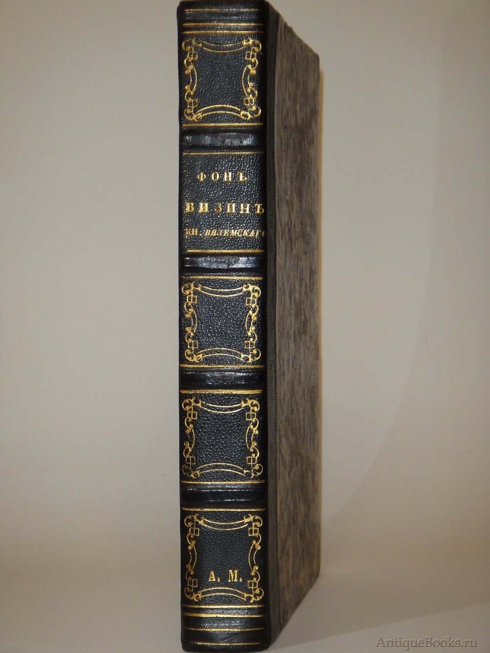 Немного увеличенный формат: 15 * 23,5см.; [2], VII, [3], V, 466, [2] стр. Экземпляр в великолепном полукожаном переплёте эпохи с золотым высокохудожественным орнаментальным тиснением на бинтовом корешке. Крышки с уголками оклеены бумагой под мрамор. Форзацы светлого тона. Шёлковое ляссе. См. Розанов " Библиотека русской поэзии И.Н.Розанова " ( стр. 42 ). Смирнов-Сокольский " Моя библиотека " ( Т. I, стр. 251. Вяземскому принадлежит большое исследование о жизни и творчестве Д.И.Фонвизина, по богатству привлечённых в нём материалах не потерявшее своего значения и сегодня ). Охлопков " Дебюты русских писателей XIX-XX веков " ( стр. 49. Первая прижизненная литературоведческая книга писателя ).