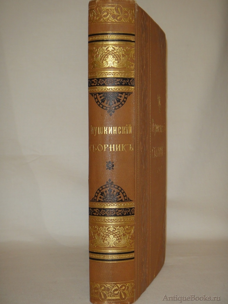 Издание, ставшее в своё время - заметным событием в литературной жизни России. Увеличенный формат: 17,5 * 25,5см.; [6], VIII, 675 стр. Экземпляр в великолепном издательском переплёте в стиле " Модерн " - работы одного из лучших мастеров переплётного искусства царской России, Поставщика Двора Его Императорского Величества Николая Гаевского. Круглёный корешок украшен золотым и цветным высокохудожественным тиснением. Передняя крышка обрамлена широкими конгревными полурамками из растительных элементов с золототиснёной надписью в среднике: " Пушкинскiй Сборникъ ". На задней крышке - декоративная рамка, изящная блинтовая орнаментированная композиция и клеймо переплётчика: " Паровая переплётная Гаевского " . Оригинальные составные форзацы с цветочным узором. Мраморный обрез. Шёлковое ляссе. На фронтисписе портрет А.С.Пушкина - офорт работы В.В.Матэ. Портрет проложен тонкой защитной калькой. Смирнов-Сокольский " Моя библиотека. Библиографическое описание " ( Т.II, № 3723 ). Смирнов-Сокольский " Русские литературные альманахи и сборники XVIII-XIX веков " ( № 1537. Напечатано 440 экземпляров. Весь доход отдан на сооружение памятника Пушкину в Петербурге ). Бесфамильная " Пушкинский Сборник. История одной книги ". Пушкинский Сборник предваряет статья " От редакции ", где объясняется основная идея создания книги: " Осенью, на обеде беллетристов, возникла мысль - издать ко дню столетия рождения А.С.Пушкина Сборник, посвящённый его имени, и весь доход с него передать на устройство в селе Михайловском, или близ Святогорского монастыря, благотворительного учреждения в память поэта ( позже, в виду некоторых изменившихся обстоятельств, собрание беллетристов постановило - сбор со Сборника пожертвовать на памятник Пушкину в Петербурге ). Мысль эта, поданная А.В.Амфитеатровым, на следующем обеде явилась уже близкой к осуществлению: было сообщено, что А.С.Суворин предлагает произвести бесплатно всю типографскую работу. Было избрано три редактора: П.П.Гнедич, Д.Л.Мордовцев и К.К.Случевский, кандидатами к ним А.В.Амфитеатров и Н.Н.Каразин, а секретарём редакции В.М.Грибовский. Исполняя возложенную на неё обязанность, редакция оповестила через газеты авторов, желающих принять участие в сборнике, - о том, куда и как присылать рукописи. Собираясь, по мере надобности, редакция имела двадцать заседаний, для разбора массы поступившего на её усмотрение материала..." Желая дать в Сборник безусловно хороший портрет Пушкина, редакция обратилась к известному офортисту - профессору гравирования В.В.Матэ с просьбой исполнить на меди крепкой водкой ( l`eau forte ) копию с портрета О.А.Кипренского. Матэ любезно согласился бескорыстно исполнить этот труд и блистательно выполнил задачу: приложенный портрет, по мнению знатоков, едва ли не лучшее изображение великого поэта. Откликнулись на идею издания и другие лица: писчебумажная фабрика Варгуниных, одно из самых передовых российских предприятий в своей отрасли, нашла возможность скинуть значительный процент с платы за бумагу; знаменитый переплётчик Н.В.Гаевский сделал крупную скидку с ценности за переплёты и бесплатно брошюровал всё издание; а типография Товарищества А.С.Суворина " Новое время безвозмездно исполнила весь труд печатания. В Пушкинском Сборнике опубликованы произведения 82-х авторов ( в отделе Поэзии - 41 и в отделе Прозы - 41 ). В отделе 