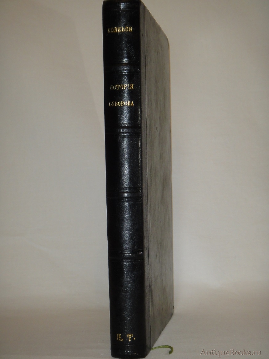 Увеличенный формат: 18 * 26,3см.; [6], I-IV, 5-340 стр. Экземпляр в добротном, стильном полукожаном переплёте эпохи с золотым тиснением на бинтовом корешке. Крышки с уголками оклеены бумагой под мрамор. Форзацы светлого тона. Шёлковое ляссе. На фронтисписе овальный погрудный портрет А.В.Суворова с его собственноручной факсимильной подписью. Одет генералиссимус в расстёгнутый белый мундир с воротником и с пуговицами в один ряд. На левой груди четыре звезды орденов Андрея Первозванного, Св. Георгия и др. На шее на ленте орден Св. Анны и на лентах 6 крестов. Под мундиром видна лента ордена Андрея Первозванного. Книга украшена 100 политипажами, отлитыми с металлических клише, рисованными Александром Коцебу, Рудольфом Жуковским, Тарасом Шевченко и гравированными на дереве в Париже Andrews, Best, le Loire и в Санкт-Петербурге Георгием Дерикером и др. Под переплётом сохранены издательские цветные художественно оформленные обложки работы М.Самойлова. Провенанс: экземпляр из коллекции известного библиофила П.М.Турищева, о чём свидетельствует суперэкслибрис " П.Т." на корешке, печатный экслибрис " Изъ книгъ библiотеки Петра Михайловича Турищева " на форзаце и штемпельный экслибрис " Изъ книгъ П.М.Турищева " на титульном листе. Знаменитое юбилейное, так называемое " морозовское " издание, самое полное и красивое.