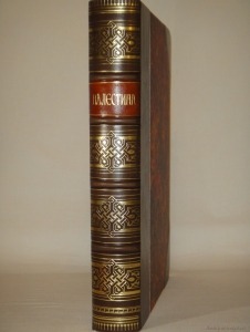 Большой формат: 23,5 * 29см.; 620 стр. Экземпляр в роскошном владельческом полукожаном переплёте. Круглёный корешок украшен золотым узорным орнаментированным тиснением и контрастной декоративной наклейкой с названием издания. Крышки с большими кожаными углами оклеены мраморной бумагой. Форзацы светлого тона. Художественный обрез. Шёлковое ляссе. Издание украшено многочисленными иллюстрациями-фотографиями Л.А.Коробова, В.А.Мамая и др., а также снимками с гравюр и картин русских и иностранных художников. Автор вступительной статьи о Палестине - духовный писатель и церковный историк Е.Н.Поселянин.