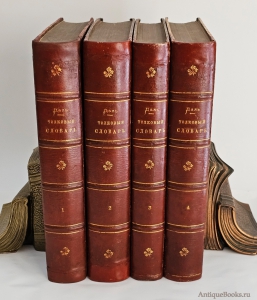 Четыре тома в старинных полукожаных переплетах. Полная комплектность. Четыре тома. Увеличенного формата: 27 х 18,5 см. Редкое второе издание, исправленное и значительно умноженное по рукописи автора. Хорошая сохранность. Издание представляет научную и историческую ценность! Даль Владимир Иванович (1801 - 1872). В.И.Даль был необыкновенно одаренной, блестяще проявившей себя в самых разных областях деятельности личностью. Он был профессиональным моряком, находился на военной службе, работал врачом и министерским чиновником, писателем, собирателем этнографических материалов, пятьдесят три года из семи десятилетий своей жизни отдал работе над составлением "Толкового словаря живого великорусского языка"(1863 - 66 гг.), за который был удостоен Ломоносовской премии Российской Академии Наук и в 1863 г. звания почетного академика. Этот основной труд всей жизни В.И.Даля не потерял своего значения до сих пор. Словарь содержит свыше 200 тысяч слов и отражает словарный состав разговорного и литературного русского языка середины XIX века, а также русских говоров. Большое место в словаре занимают фразеология, пословицы, поговорки, сравнения, значение слов раскрывается через синонимы, описательные и энциклопедические толкования и синонимические словосочетания. Именно Даль ввел термин "толковый" применительно к словарю. Он хотел показать в словаре источники и механизмы обновления русской литературной речи, пути освобождения от чужеродных заимствований, раскрыть для общества "неисчерпаемый родник живого языка русского". Это словарь представляет собой своеобразную энциклопедию народной русской жизни первой половины XIX века, в нем содержится огромный этнографический материал, относящийся к разным сторонам хозяйственной и духовной жизни. Словарь Даля используется и до сих пор как выдающийся образец словарной работы, не потерявший своей актуальности.