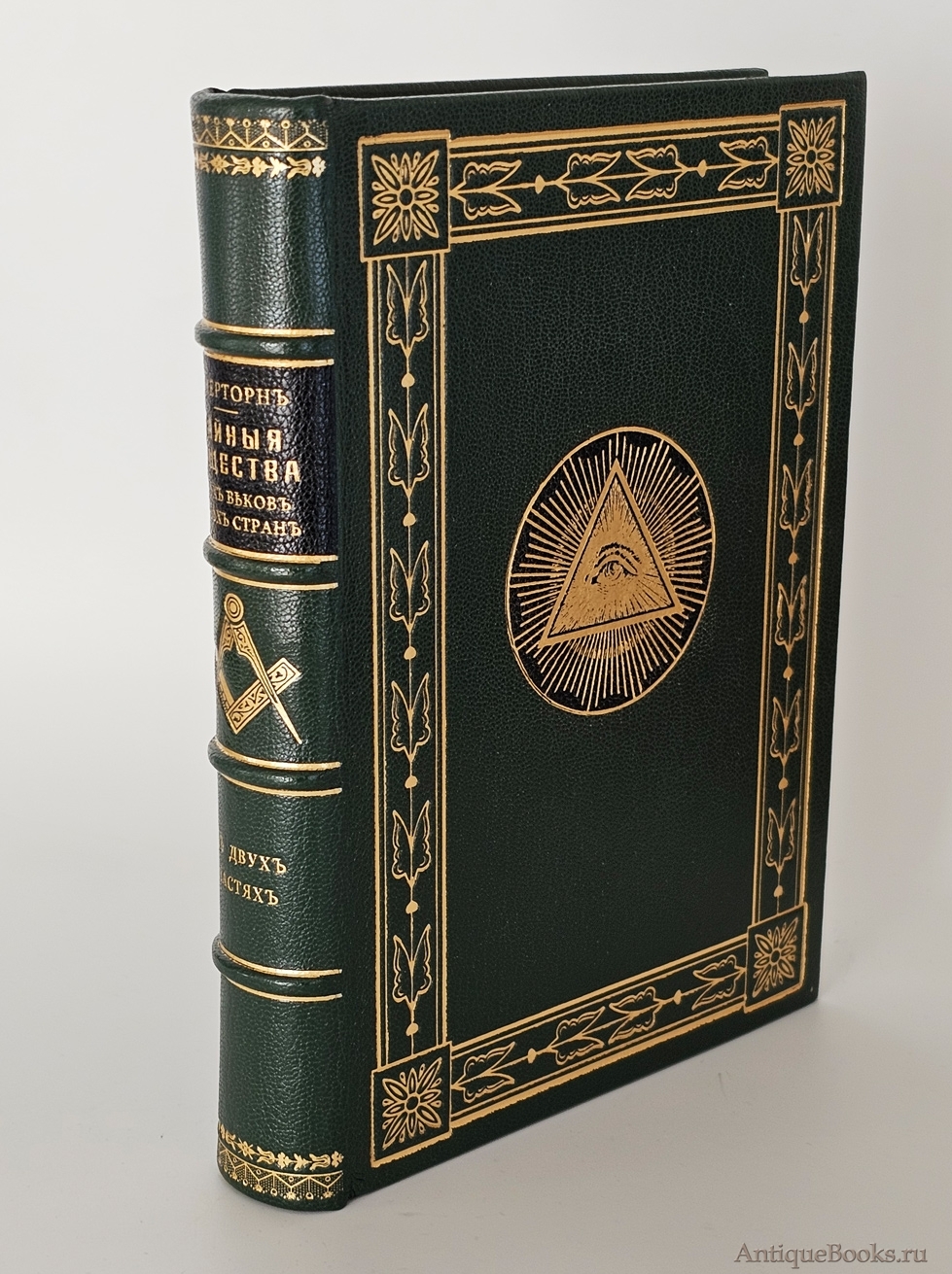 Экземпляр в современном цельнокожаном переплёте. Корешок украшен известным масонским символом - циркуль с линейкой, на крышке переплета изображен масонский символ, символизирующий Великого Архитектора Вселенной - всевидящее око (глаз, вписанный в треугольник). Труд состоит из двух томов. Т.1: 304 стр., т.2: 250 стр. Формат: 22 x 16,5 см. Полный комплект двух частей в одном переплете. Редкость.