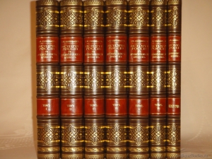 Большеформатное издание: 19,5 * 27,5см. Экземпляр в изысканных, эксклюзивных современных полукожаных переплётах, выполненных в лучших традициях переплётного искусства XIX - начала XX веков. Круглёные корешки украшены золотым высокохудожественным узорным тиснением, четырьмя декоративными бинтами и двумя золототиснёными контрастными вставками с указанием имени автора, названия издания и порядкового номера тома. Крышки и форзацы оклеены мраморной бумагой. Шёлковое ляссе. На фронтисписе второго тома на веленевой бумаге помещён портрет историка с указанием дат его жизни, а также лист факсимиле. Три листа складных таблиц ( две в первом томе и одна в седьмом ). Второе издание ( 1-ое издание выходило выпусками ).