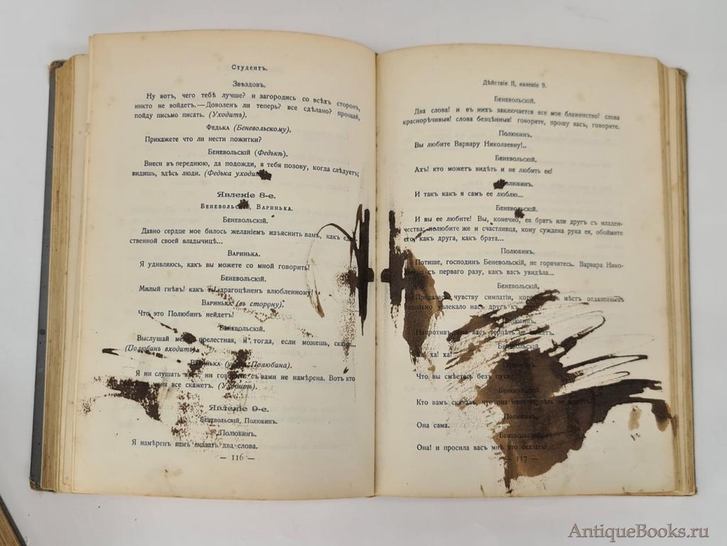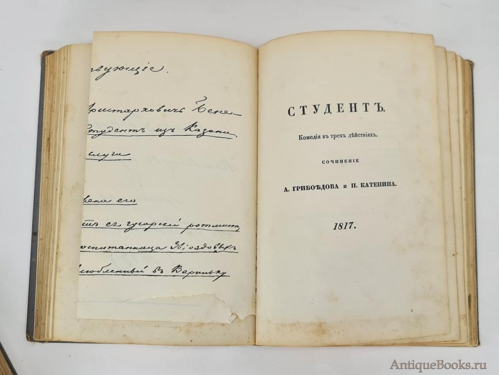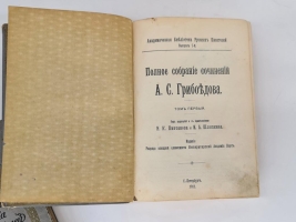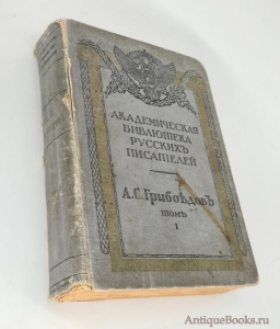Под редакцией и с примечаниями М.К.Пиксанова и А.И.Шляпкина. VIII, CXLVII, 328 стр; литографированный портретА.С.Грибоедова, иллюстрации, факсимиле. Из серии "Академическая Библиотека Русских Писателей". Книга в издательском переплете. Сзади корешок отходит от блока. В середине книги пятна от черных чернил. Настоящий сборник дает возможность лучше узнать творчество Грибоедова. В первый том собрания сочинений писателя вошли: биографический очерк, стихотворения, стихотворения, приписываемые Грибоедову, драматические сочинения - "Молодые супруги", "Студент", "Притворная Неверность", "Юность вещего", "Радамист и Зенобия", "1812 год", "Грузинская ночь" и другие; а также примечания к стихотворениям и драматическим сочинениям.