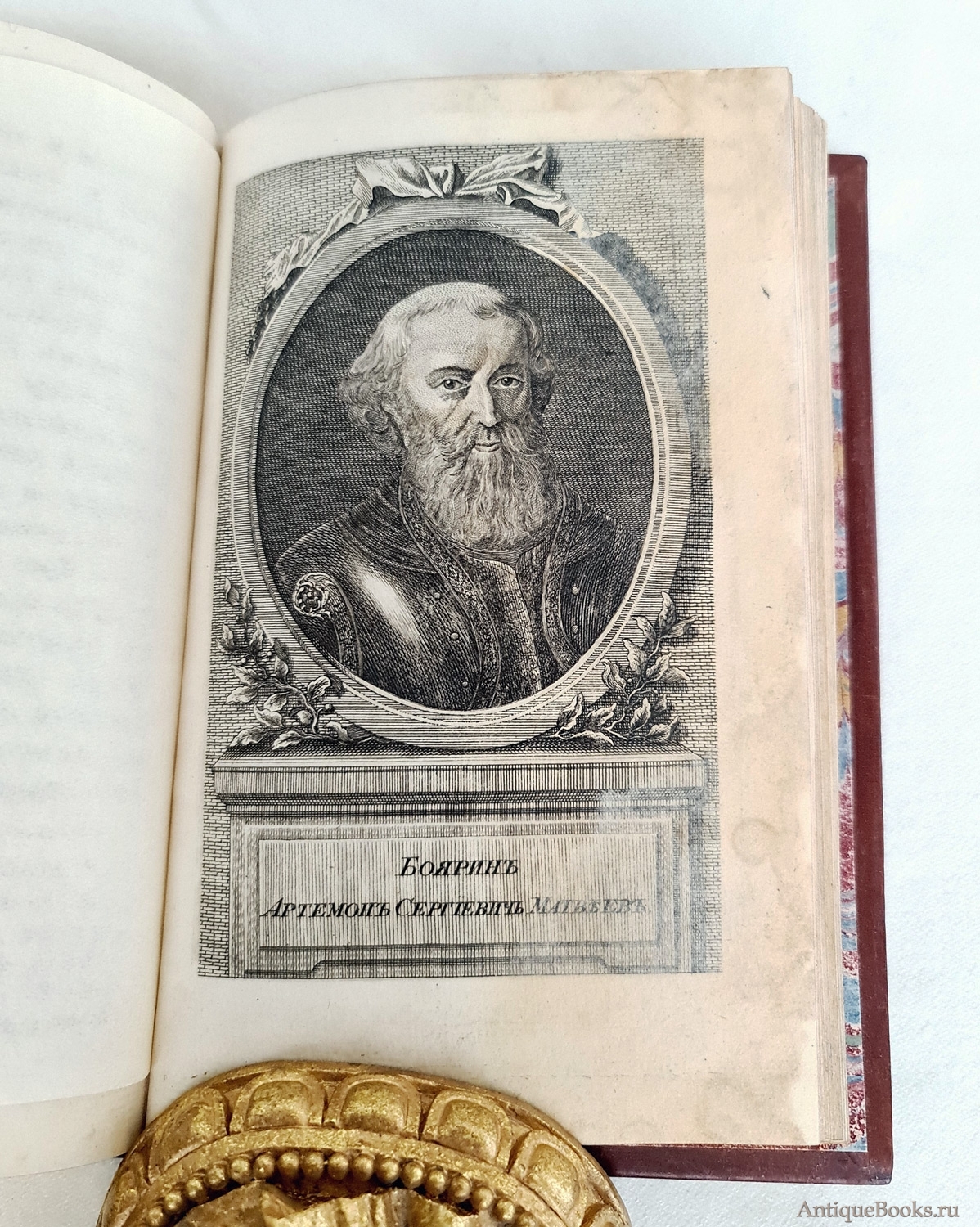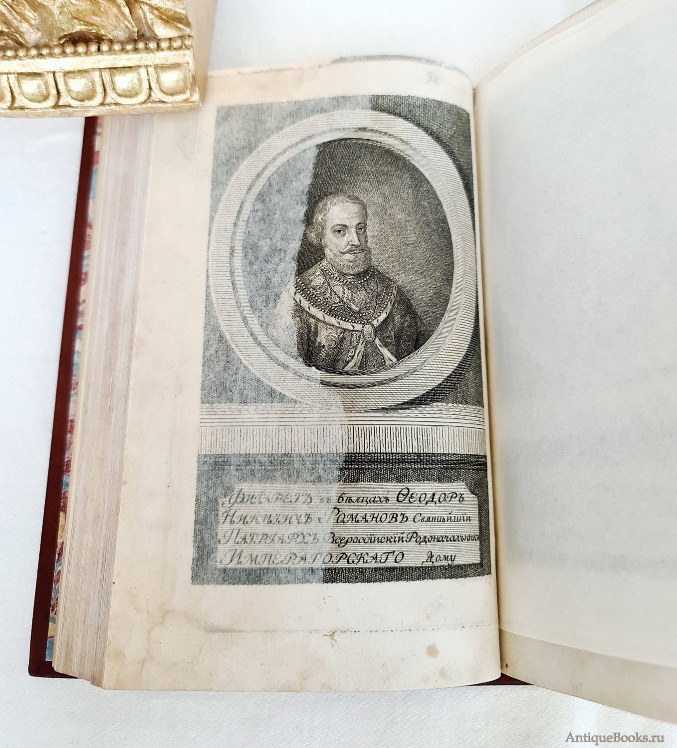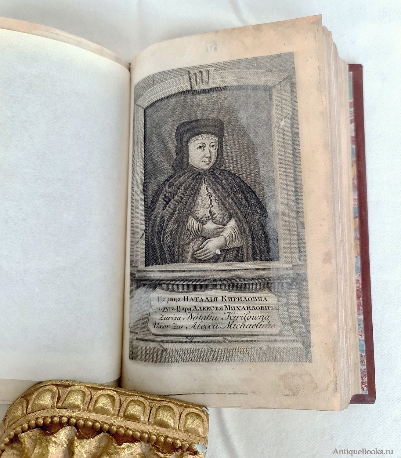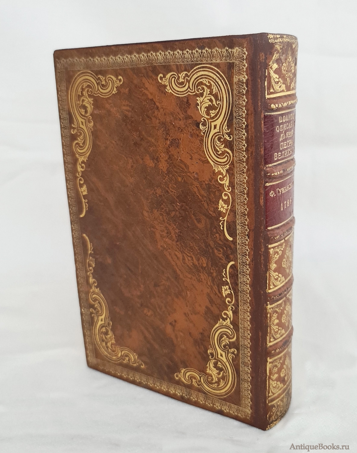 Одна из лучших гравированных книг XVIII Века! В цельнокожаном переплете первой половины XVIII века с художественным золотым тиснением на корешке и крышке. С золотым трехсторонним обрезом. Заглавный гравированный лист, 3-и ненумер. листа, IX - LXI, 282 стр. 4 ненумер. листа, 11 гравированных портретов исторических лиц на отдельных листах, 6-ть гравированных виньеток. Формат: 20x13,5 см. Загрязнения, реставрация страниц японской бумагой. Личный штемпель "Из библиотеки К.Я. Голейзовского" (Касьян Ярославович Голейзовский (1892-1970) — один из крупнейших российских и советских хореографов, балетмейстер Большого театра. Сотрудничал с Д.Д. Шостаковичем, Л.О. Утесовым, И.Д. Дунаевским. Ставил танцы великим танцорам балета Е. Максимовой и В. Васильеву.) Из объявленных автором пяти частей вышла только первая. В 1788 году вышло издание Фёдора Осиповича Туманского, посвящённое жизни и деятельности императора Петра I. Название — «Полное описание деяний его величества государя императора Петра Великого» (вариант заглавия — «Жизнь и деяния государя императора Петра Великого»). В книге гравированный титульный лист с заглавием; посвящение императрице Екатерине II на страницах III–VIII; иллюстрации, портреты Петра I, патриарха Филарета, царя Михаила Федоровича и других исторических лиц; на отдельном листе — изображение медали на рождение Петра I. Иллюстрации, портреты: императора Петра I с подписью: "Вырезан с подлинника хранящагося у его сиятельства графа Ивана Григорьевича Чернышева"; патриарха Филарета (а также на виньетке на стр. 97); инокини Марфы; царя Михаила Федоровича; царя Алексея Михайловича; царицы Наталии Кирилловны; царя Федора Алексеевича; царевны Софьи Алексеевны; боярина А.С. Матвеева; царя Ивана V Алексеевича. С разных оригиналов. На отдельном листе изображение медали на рождение Петра I, на лицевой стороне которой портрет царя Алексея Михайловича и царицы Наталии Кирилловны. Резцовая гравюра (портрет царя Иоанна Алексеевича - гравюра резцом и пунктиром). Виньетки глубокой печати на стр. 1, 94, 97, 150, 153 и 258. Предположительно, гравированы резцом. В конце предисл. (С.LVI) автор сообщает: "Не могу умолчать, что помощник и почти сотрудник мой в сем деле ... Николай Николаевич Бантыш Каменский ... много меня подкрепил и одобрил". Безусловная большая редкость. Данная работа посвящена жизни и деятельности императора Петра I, а также его ближайших сановников. В первой части данной работы приводится краткая история России вплоть до детства и юношества Петра, а также первые политические и дипломатические шаги будущего императора, показана борьба в верхах в конце XVII века. Книга крайне интересна для изучения состояния культурной атмосферы конца XVIII века, оценки исторического знания XVIII века. Коллекционное значение книги также высокое. Она входит в круг коллекционирования русских иллюстрированных изданий, книг о Петре I, русской иконографии и, конечно, в число «документированных редкостей», которые (увы) являются предметом собирания за одно это качество. Библиография: - "Сводный каталог русской книги гражданской печати XVIII века" № 7402; - Битовт Ю. «Редкие русские книги и летучие издания 18-го века». Москва, 1905, № 2212; - Геннади. "Русские книжные редкости", № 62: ("Сужу о редкости этой книги потому, что долго искал ее и с трудом нашел полный экземпляр со всеми портретами (за 15 р.)"); - Острогла