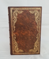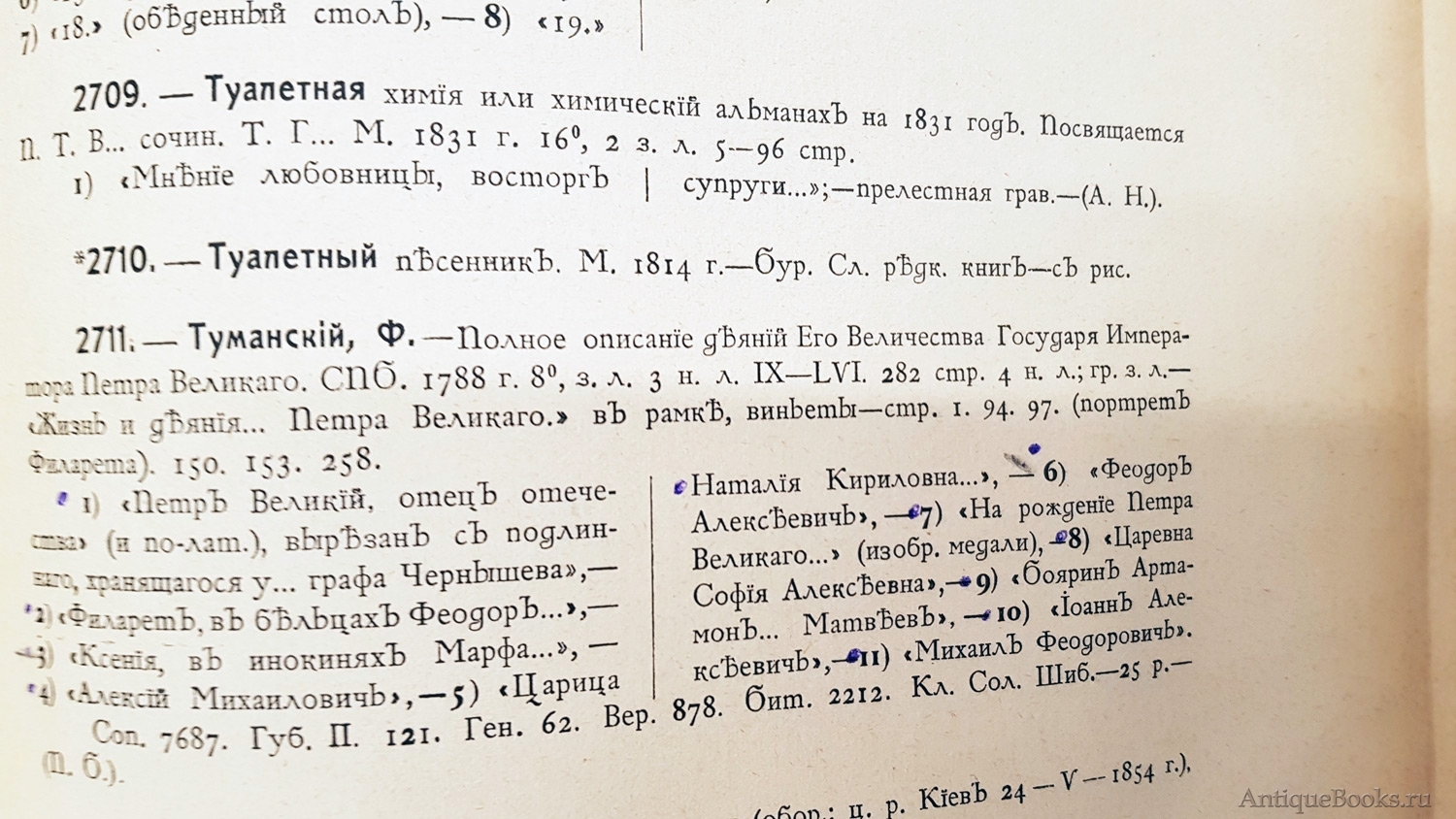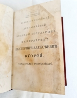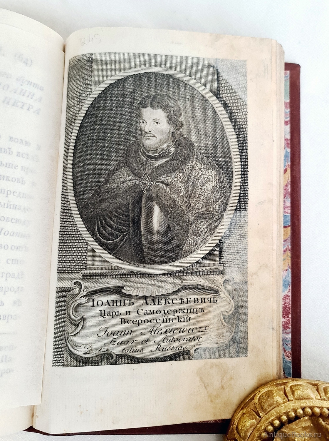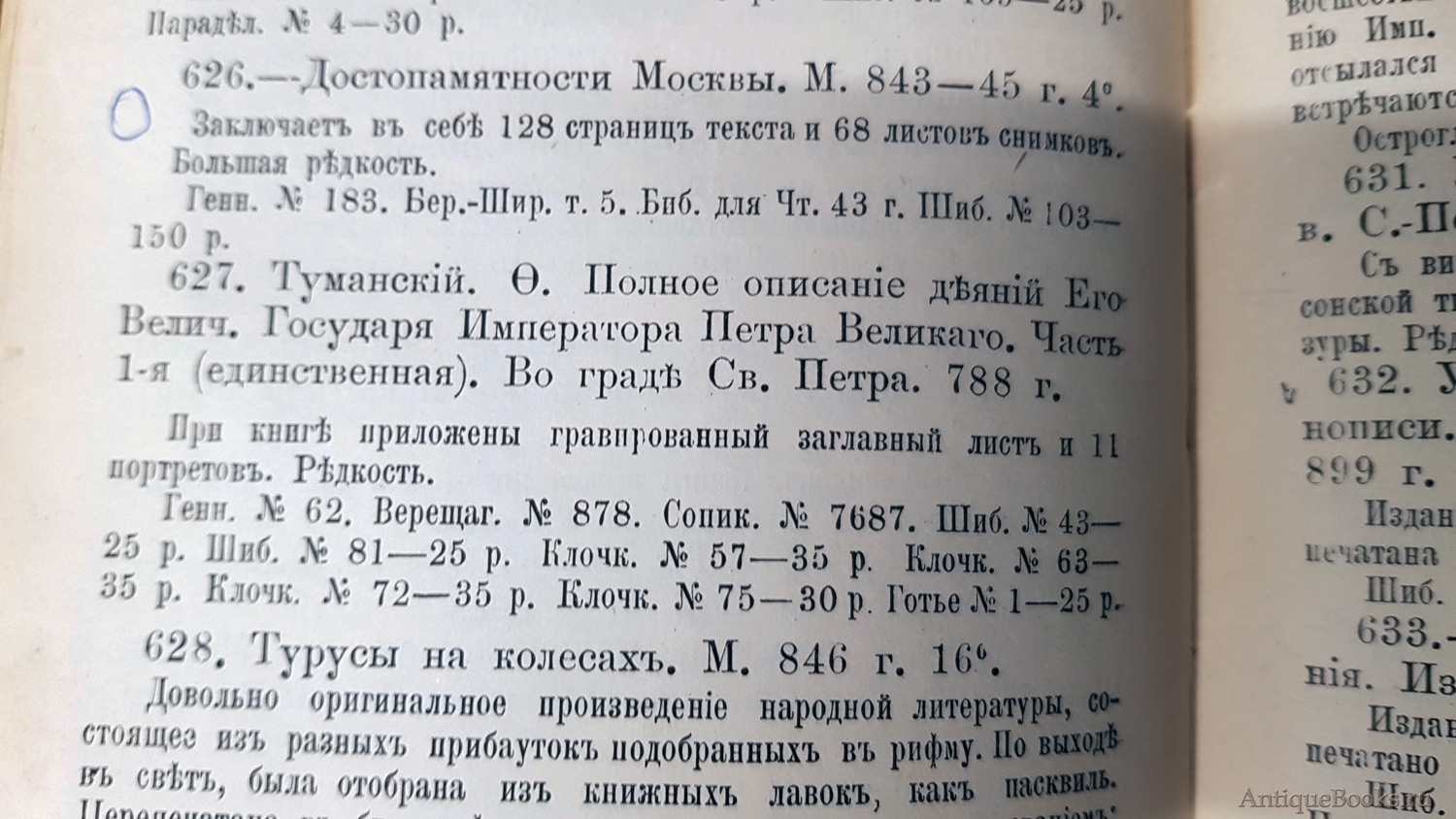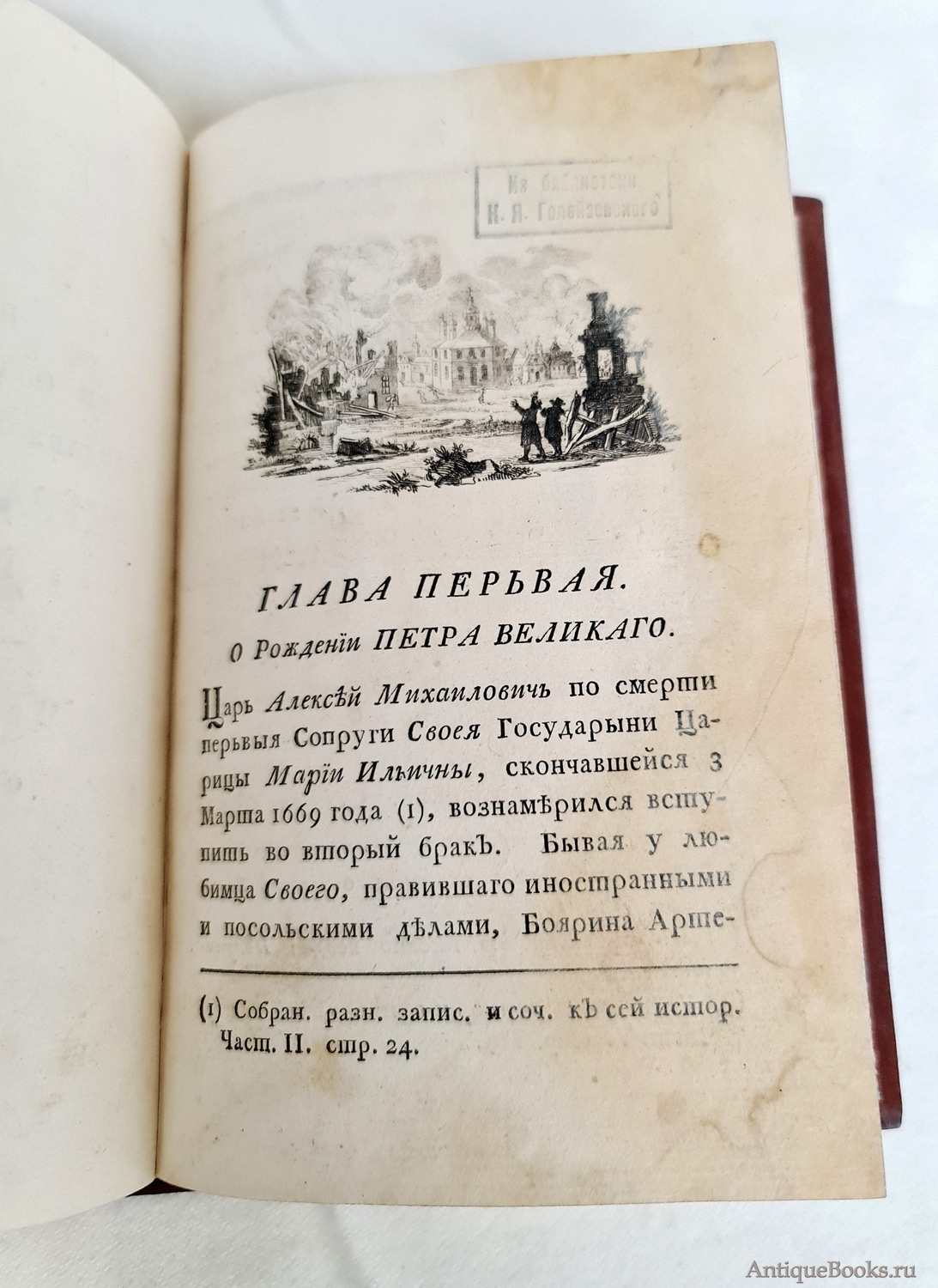 Одна из лучших гравированных книг XVIII Века! В цельнокожаном переплете первой половины XVIII века с художественным золотым тиснением на корешке и крышке. С золотым трехсторонним обрезом. Заглавный гравированный лист, 3-и ненумер. листа, IX - LXI, 282 стр. 4 ненумер. листа, 11 гравированных портретов исторических лиц на отдельных листах, 6-ть гравированных виньеток. Формат: 20x13,5 см. Загрязнения, реставрация страниц японской бумагой. Личный штемпель "Из библиотеки К.Я. Голейзовского" (Касьян Ярославович Голейзовский (1892-1970) — один из крупнейших российских и советских хореографов, балетмейстер Большого театра. Сотрудничал с Д.Д. Шостаковичем, Л.О. Утесовым, И.Д. Дунаевским. Ставил танцы великим танцорам балета Е. Максимовой и В. Васильеву.) Из объявленных автором пяти частей вышла только первая. В 1788 году вышло издание Фёдора Осиповича Туманского, посвящённое жизни и деятельности императора Петра I. Название — «Полное описание деяний его величества государя императора Петра Великого» (вариант заглавия — «Жизнь и деяния государя императора Петра Великого»). В книге гравированный титульный лист с заглавием; посвящение императрице Екатерине II на страницах III–VIII; иллюстрации, портреты Петра I, патриарха Филарета, царя Михаила Федоровича и других исторических лиц; на отдельном листе — изображение медали на рождение Петра I. Иллюстрации, портреты: императора Петра I с подписью: "Вырезан с подлинника хранящагося у его сиятельства графа Ивана Григорьевича Чернышева"; патриарха Филарета (а также на виньетке на стр. 97); инокини Марфы; царя Михаила Федоровича; царя Алексея Михайловича; царицы Наталии Кирилловны; царя Федора Алексеевича; царевны Софьи Алексеевны; боярина А.С. Матвеева; царя Ивана V Алексеевича. С разных оригиналов. На отдельном листе изображение медали на рождение Петра I, на лицевой стороне которой портрет царя Алексея Михайловича и царицы Наталии Кирилловны. Резцовая гравюра (портрет царя Иоанна Алексеевича - гравюра резцом и пунктиром). Виньетки глубокой печати на стр. 1, 94, 97, 150, 153 и 258. Предположительно, гравированы резцом. В конце предисл. (С.LVI) автор сообщает: "Не могу умолчать, что помощник и почти сотрудник мой в сем деле ... Николай Николаевич Бантыш Каменский ... много меня подкрепил и одобрил". Безусловная большая редкость. Данная работа посвящена жизни и деятельности императора Петра I, а также его ближайших сановников. В первой части данной работы приводится краткая история России вплоть до детства и юношества Петра, а также первые политические и дипломатические шаги будущего императора, показана борьба в верхах в конце XVII века. Книга крайне интересна для изучения состояния культурной атмосферы конца XVIII века, оценки исторического знания XVIII века. Коллекционное значение книги также высокое. Она входит в круг коллекционирования русских иллюстрированных изданий, книг о Петре I, русской иконографии и, конечно, в число «документированных редкостей», которые (увы) являются предметом собирания за одно это качество. Библиография: - "Сводный каталог русской книги гражданской печати XVIII века" № 7402; - Битовт Ю. «Редкие русские книги и летучие издания 18-го века». Москва, 1905, № 2212; - Геннади. "Русские книжные редкости", № 62: ("Сужу о редкости этой книги потому, что долго искал ее и с трудом нашел полный экземпляр со всеми портретами (за 15 р.)"); - Острогла