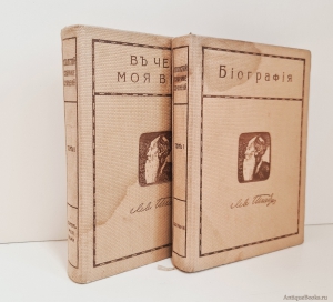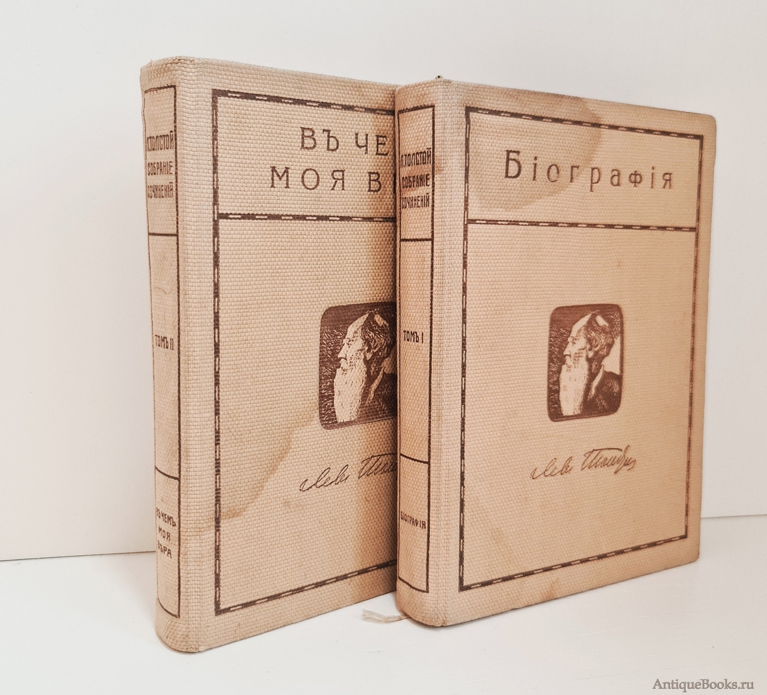 Два тома в издательских тканевых переплетах уменьшенного формата 19х14,5 см, ляссе в каждом томе. На лицевой части переплетов разводы от воды. В конце книги 16 листов с рекламой. Лев Николаевич Толстой, возможно, самый известный российский писатель в мире, непревзойденный прозаик, открывший, по словам В. Набокова "метод изображения жизни, который точнее всего соответствует нашему представлению о ней... Проза Толстого течет в такт нашему пульсу, его герои движутся в том же темпе, что прохожие под нашими окнами, пока мы сидим над книгой". Содержание томов: Том 1. Краткая биография Льва Николаевича Толстого. Составлена П.И. Бирюковым. 208 стр. 16 стр. рекламы. Том 2. В чем моя вера. Исповедь. Религия и нравственность. 392 стр. 16 стр. рекламы.