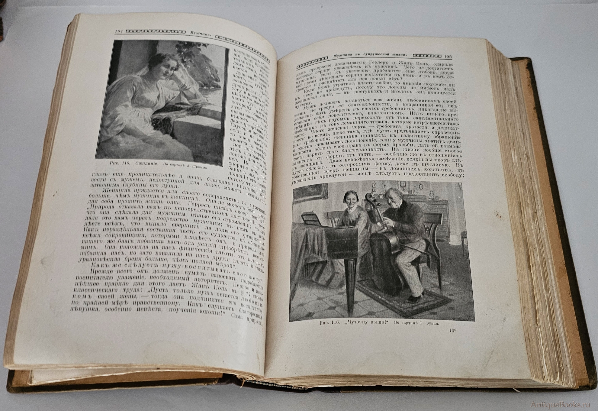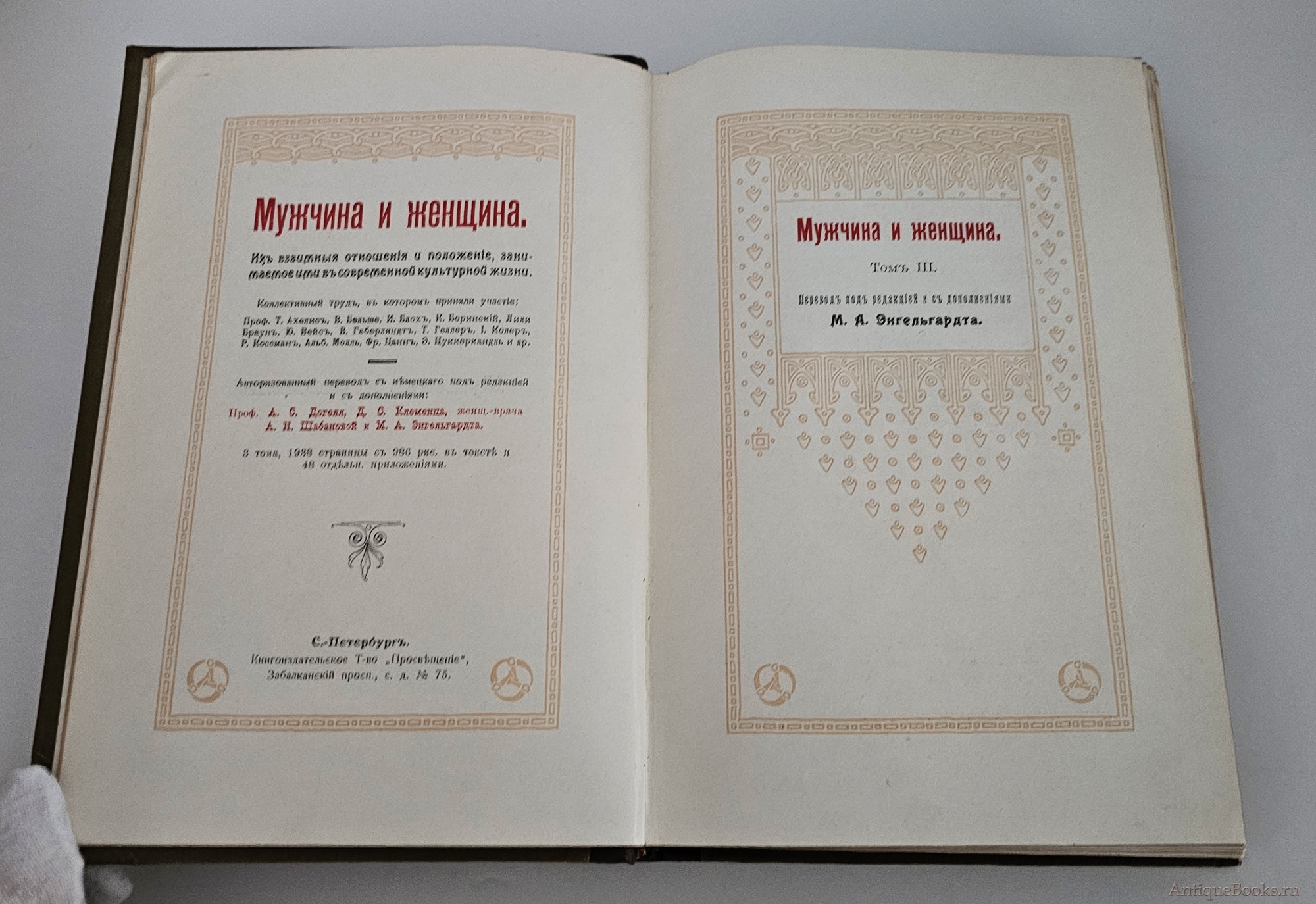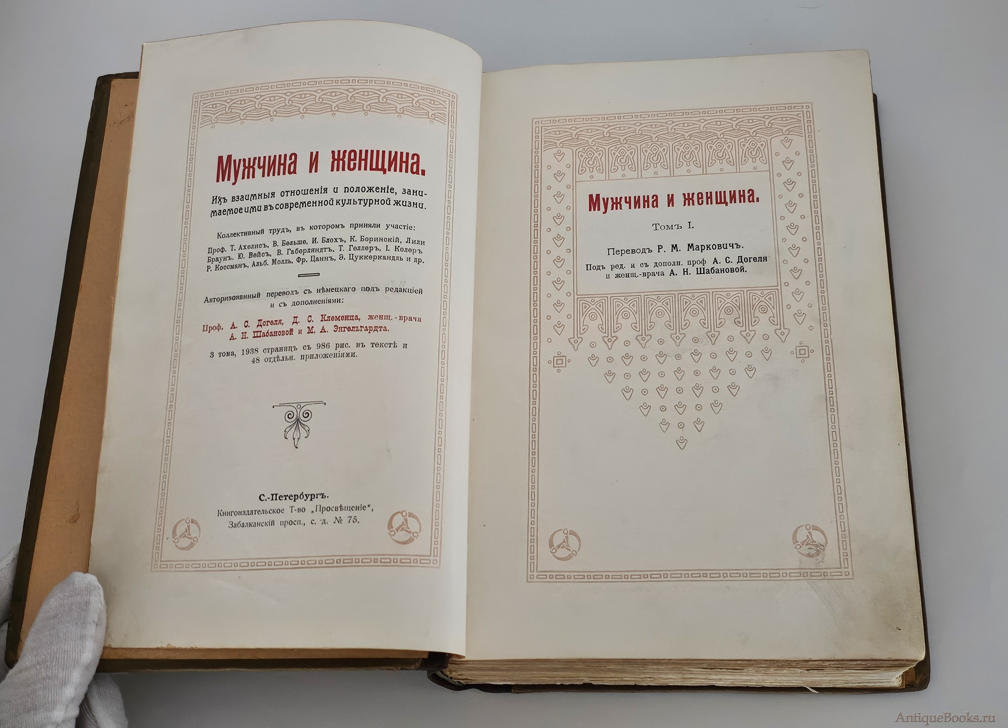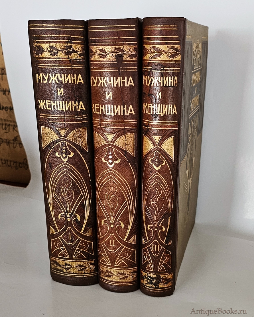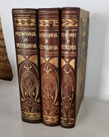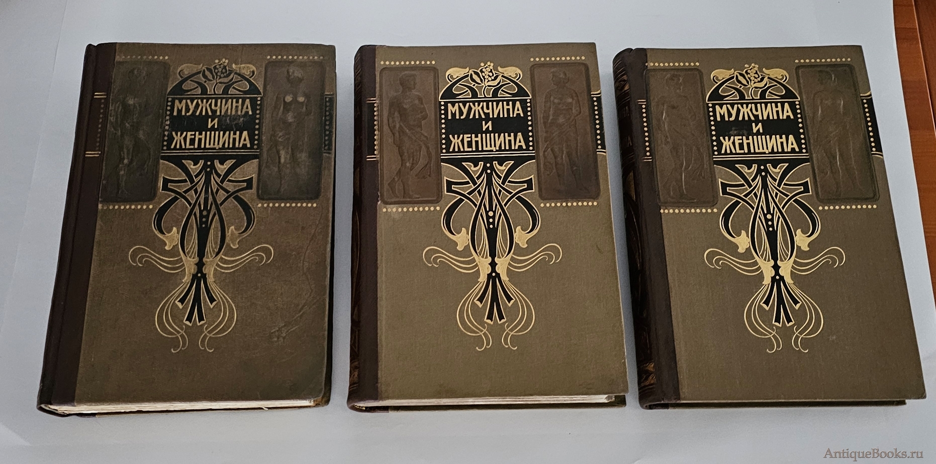 Три тома в издательских полукожаных переплётах с узорным золотым тиснением на корешках. На верхних крышках - барельефные рисунки. Мелованная бумага. Издание богато иллюстрировано. Полный комплект. Хорошая сохранность. Увеличенный формат: 26 x 17 см., 986 рисунков в тексте и 48 отдельных приложений. Том 1. XIV, [2], 739, 6 стр. Том 2. XII, 668 стр. Том 3. XII, 492 стр. Знаменитая немецкая энциклопедия, рассматривающая историю взаимоотношений полов. Среди авторов книги были биологи, врачи, историки, культурологи, философы. В издании освещены практически все аспекты истории, социологии, психологии, биологии полов. Изучаются вопросы эстетики: красота женского тела и ее отражение в искусстве; разделение хозяйственных функций полов, место женщин в традиционном и современном обществе. Коллективный труд, в котором приняли участие: проф. Т.Ахелис, В.Бельше, И.Блох, Боринский, Лили Браун, Ю.Вейс, В.Габерляндт, Т.Геллер, И.Колер, Р.Коссман, Альб.Моль, Фр.Цанн, Э.Цуккеркандль и др. Авторизованный перевод с немецкого под редакцией и с дополнениями: проф. А.С.Догеля, Д.С.Клеменца, женщины-врача А.Н.Шабановой и М.А.Энгельгардта.