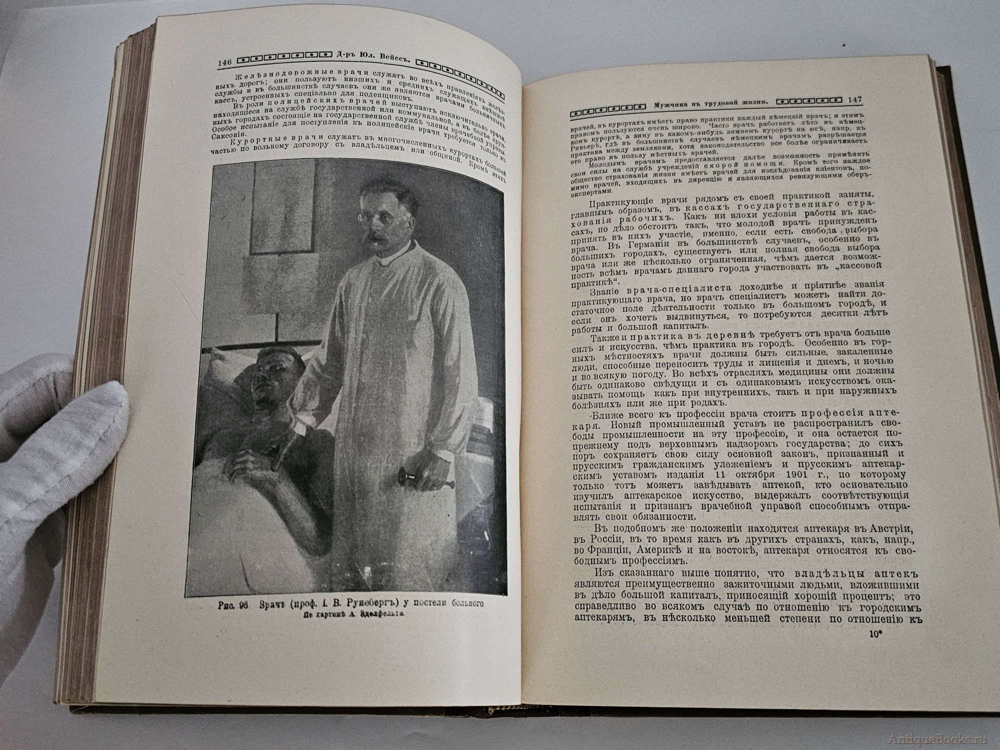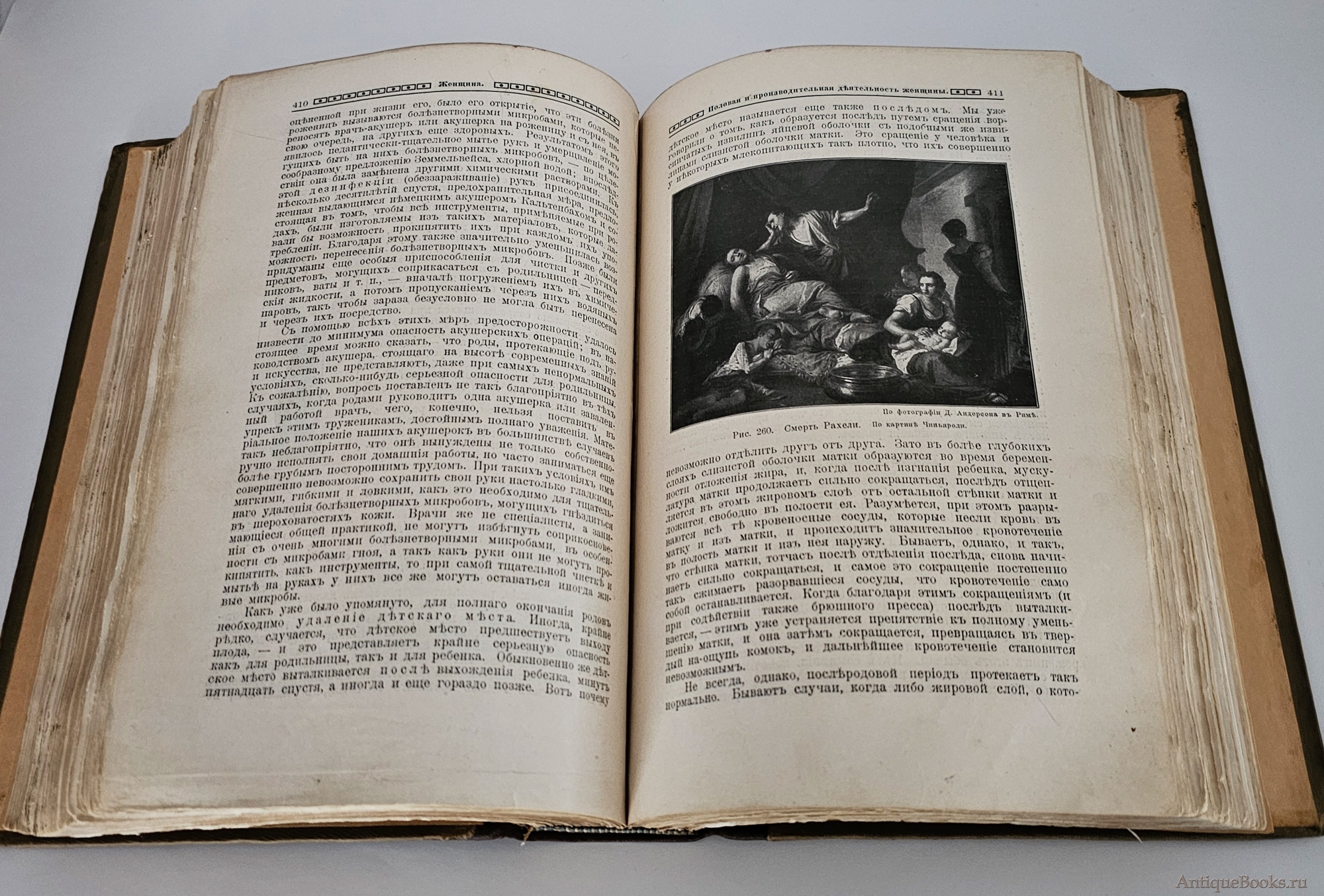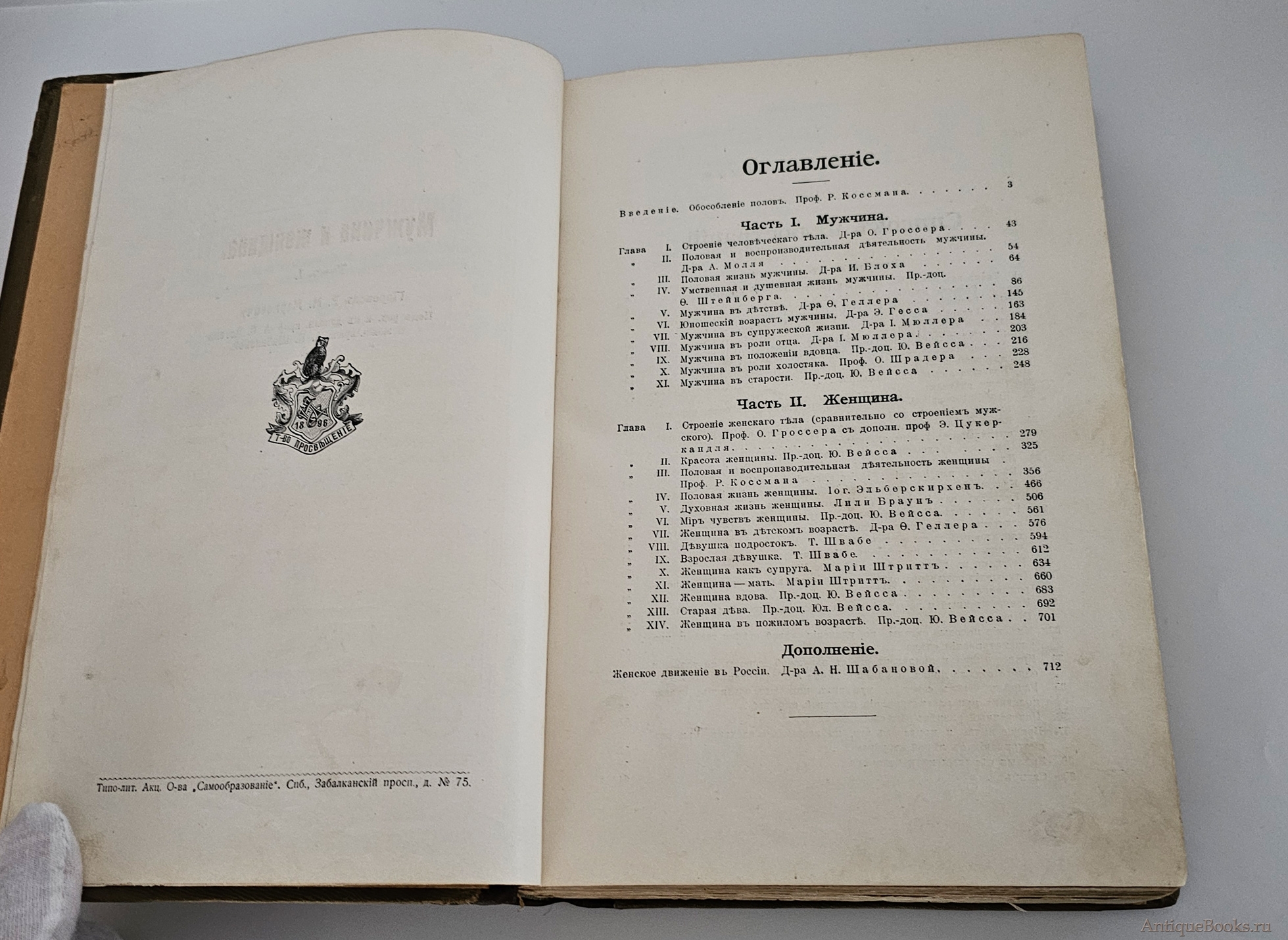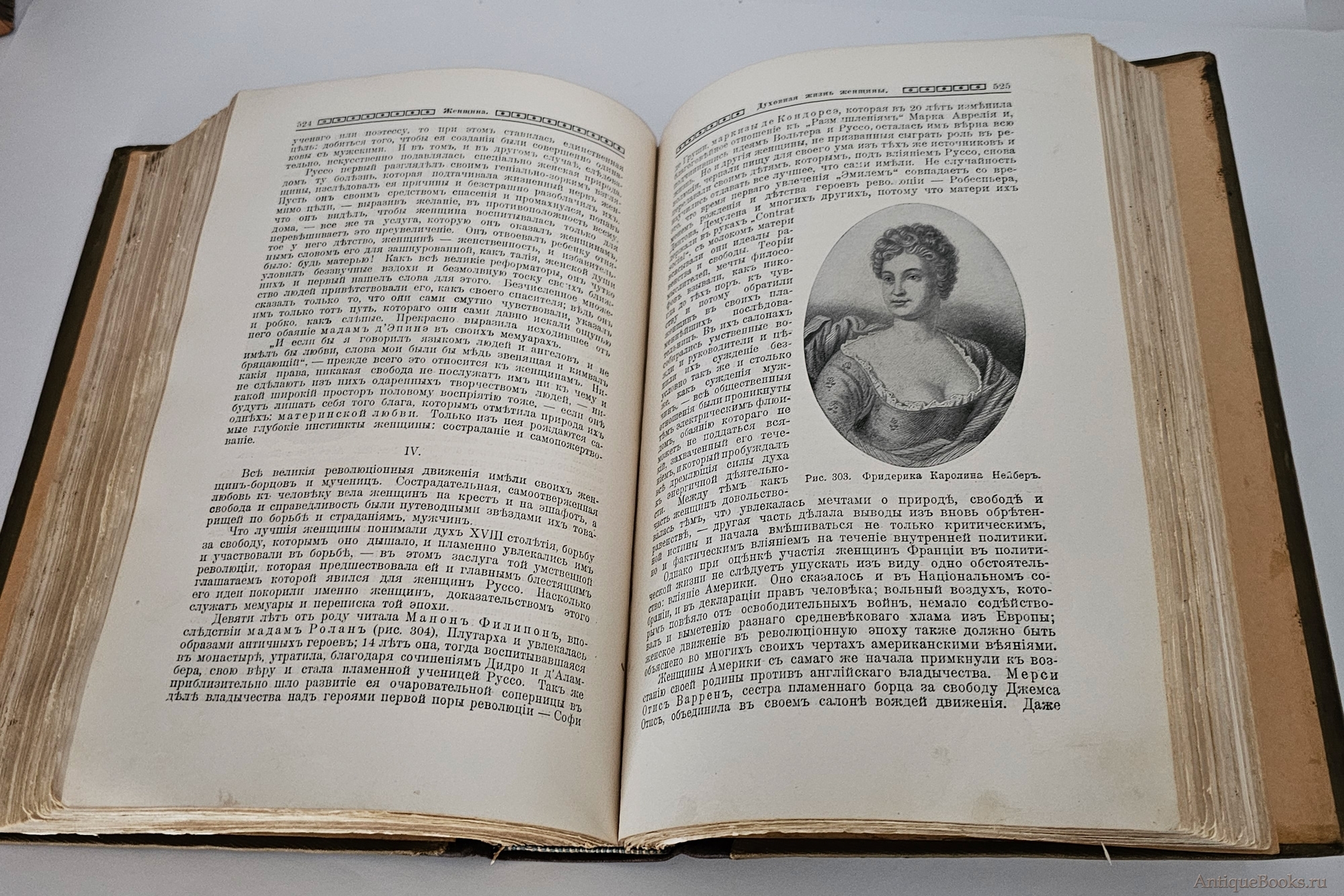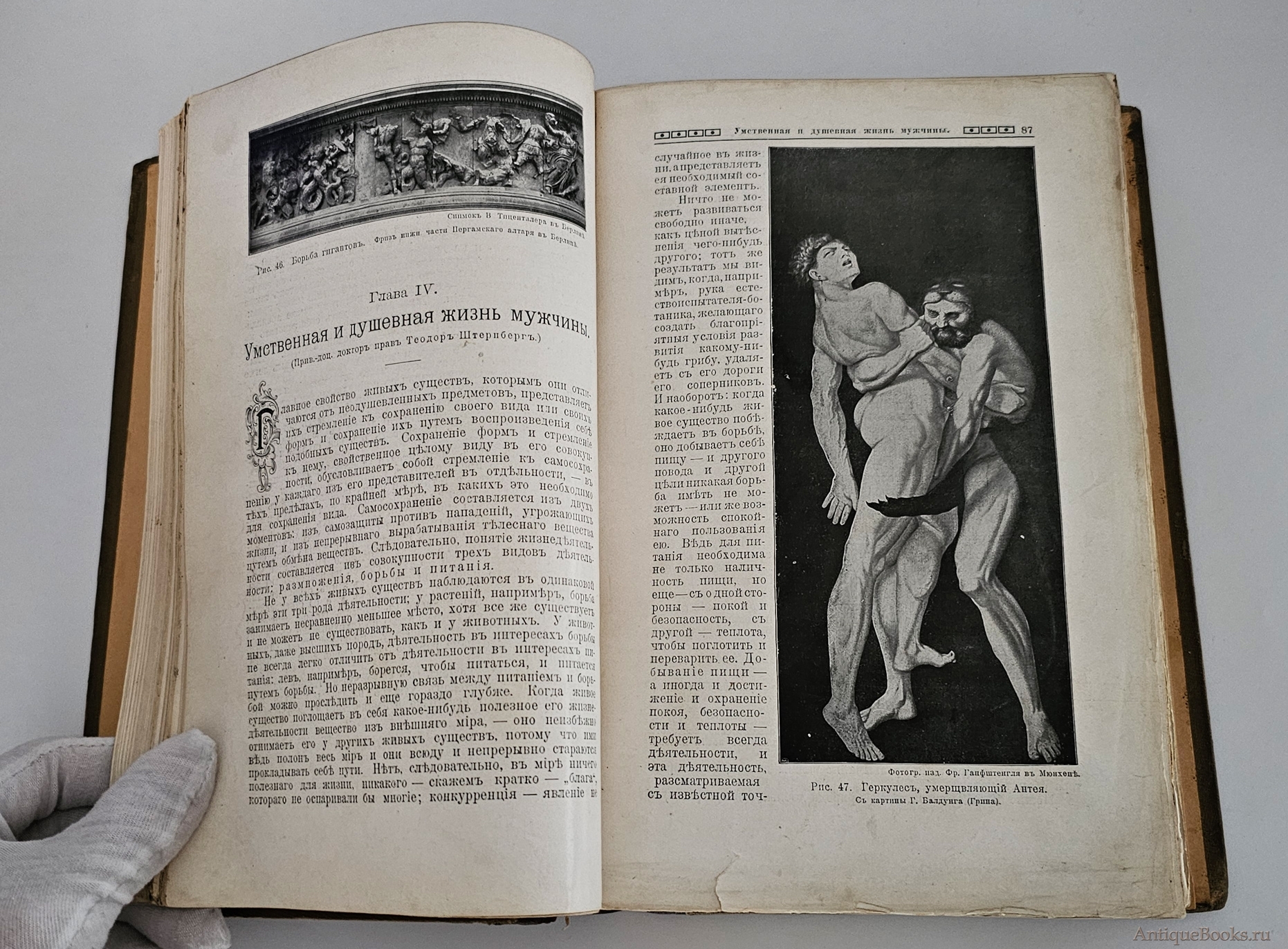 Три тома в издательских полукожаных переплётах с узорным золотым тиснением на корешках. На верхних крышках - барельефные рисунки. Мелованная бумага. Издание богато иллюстрировано. Полный комплект. Хорошая сохранность. Увеличенный формат: 26 x 17 см., 986 рисунков в тексте и 48 отдельных приложений. Том 1. XIV, [2], 739, 6 стр. Том 2. XII, 668 стр. Том 3. XII, 492 стр. Знаменитая немецкая энциклопедия, рассматривающая историю взаимоотношений полов. Среди авторов книги были биологи, врачи, историки, культурологи, философы. В издании освещены практически все аспекты истории, социологии, психологии, биологии полов. Изучаются вопросы эстетики: красота женского тела и ее отражение в искусстве; разделение хозяйственных функций полов, место женщин в традиционном и современном обществе. Коллективный труд, в котором приняли участие: проф. Т.Ахелис, В.Бельше, И.Блох, Боринский, Лили Браун, Ю.Вейс, В.Габерляндт, Т.Геллер, И.Колер, Р.Коссман, Альб.Моль, Фр.Цанн, Э.Цуккеркандль и др. Авторизованный перевод с немецкого под редакцией и с дополнениями: проф. А.С.Догеля, Д.С.Клеменца, женщины-врача А.Н.Шабановой и М.А.Энгельгардта.