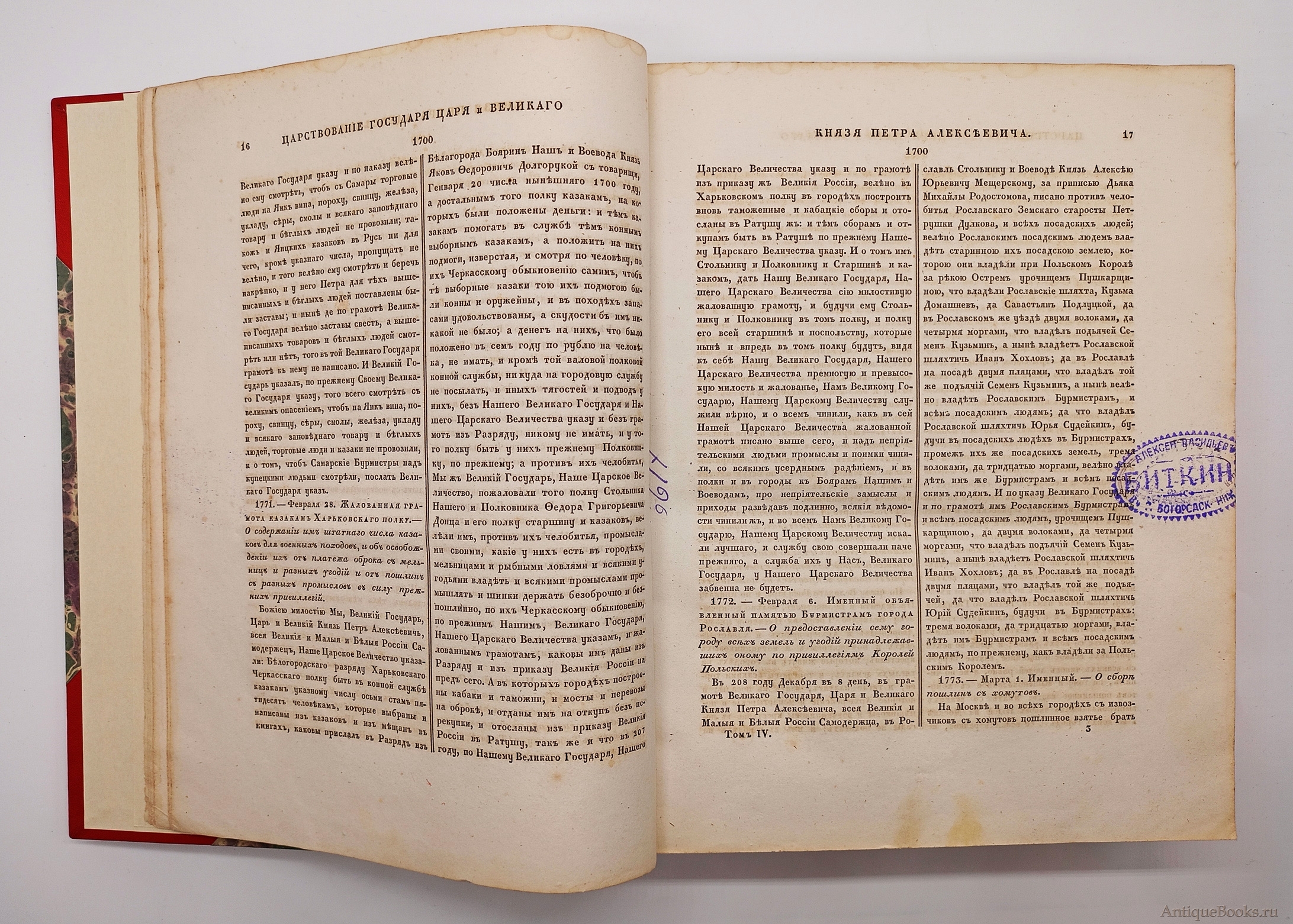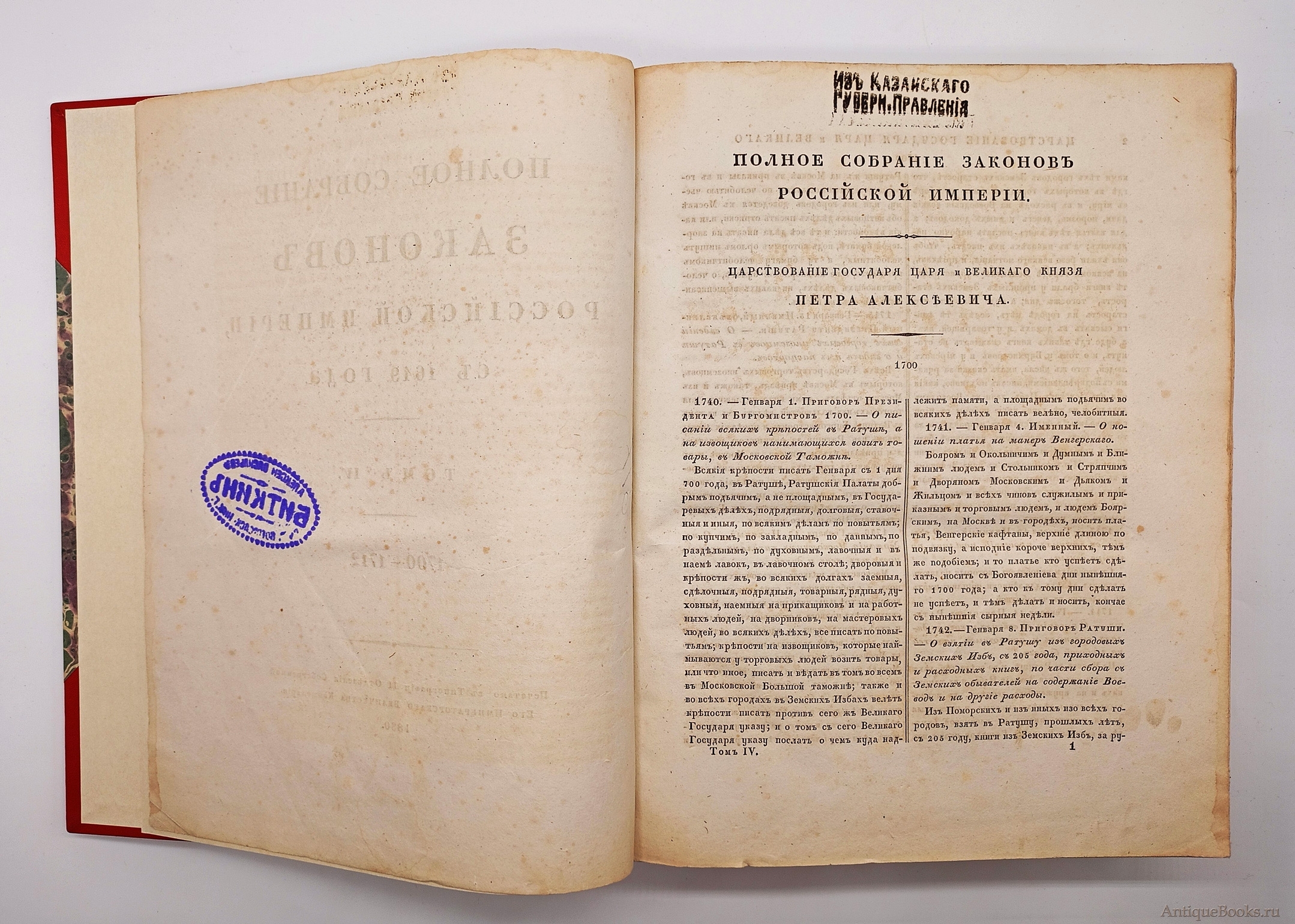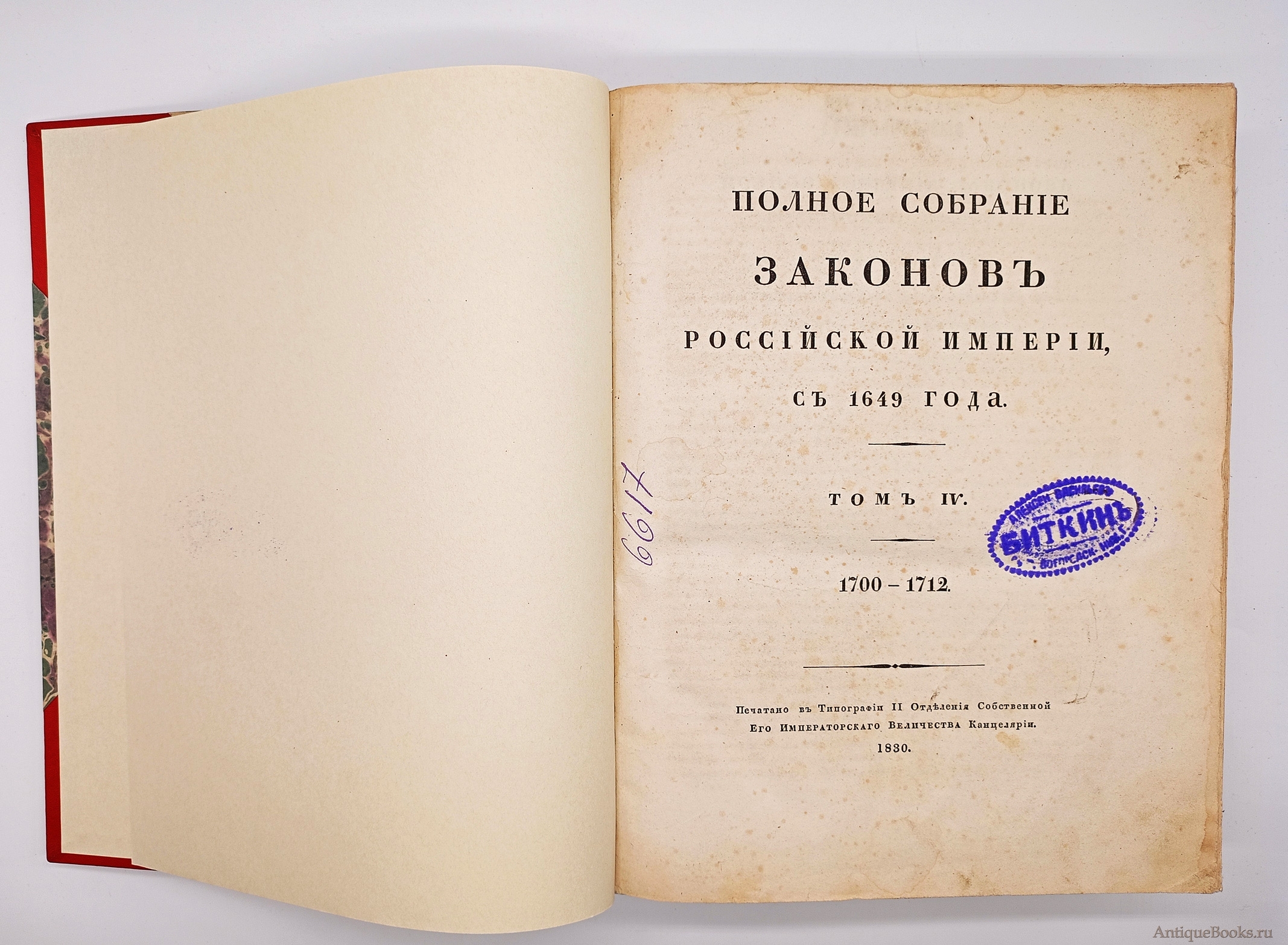 Книга в полукожаном переплете. Состояние очень хорошее. Том IV - с 1700 по 1712 г. [1], 881, 7 стр. Полное собрание законов Российской империи (ПСЗ), наиболее полный сборник законодательных актов, расположенных в хронологическом порядке, по номерам утверждения каждого акта царём. Содержит, в частности, законы о порядке заседаний и делопроизводства в Правительствующем Сенате, о вызове иностранцев в Россию и другие. Кодификация законов в России началась во 2-й четверти XIX в. и связана с попытками царизма в условиях кризиса феодально-крепостнического строя и усиления буржуазных отношений укрепить государственный и общественный строй России. Составлением и изданием ПСЗ занимались 2-е отделение собственной его императорского величества канцелярии (1826-1882), Кодификационный отдел Государственного совета (1882-1893) и Отделение свода законов Государственной канцелярии (1893-1917). ПСЗ включало все разновидности законодательных актов дореволюционной России: манифесты, "учреждения", положения, уложения, уставы, рескрипты, "высочайше утвержденные" мнения Государственного совета, журналы Комитета и Совета министров, именные указы и пр. Не включались акты церковного управления (предполагалось издание отдельного "Собрания узаконений" церковного ведомства), а также законодательные акты, касавшиеся императорского двора и придворного ведомства вообще (из-за нежелания огласки). В дореволюционной России было 3 издания ПСЗ. Первое издание 1830 г., составленное под руководством М. М. Сперанского, включает более 30 тысяч законодательных актов с 1649 по 1825 г (45 томов) — время правления Алексея Михайловича — Александра I (33 тома).