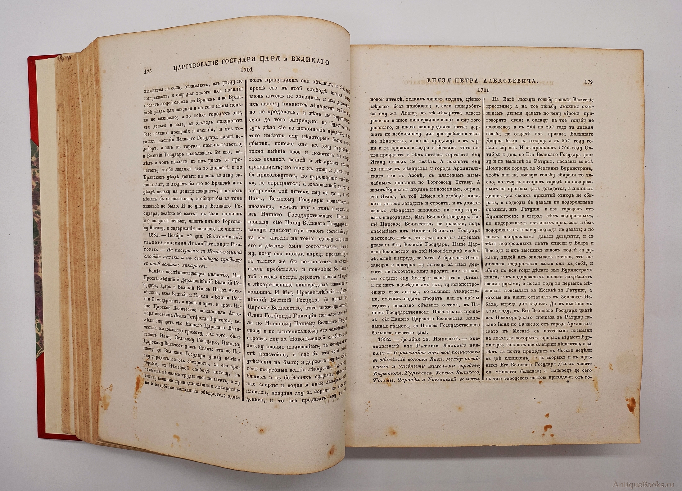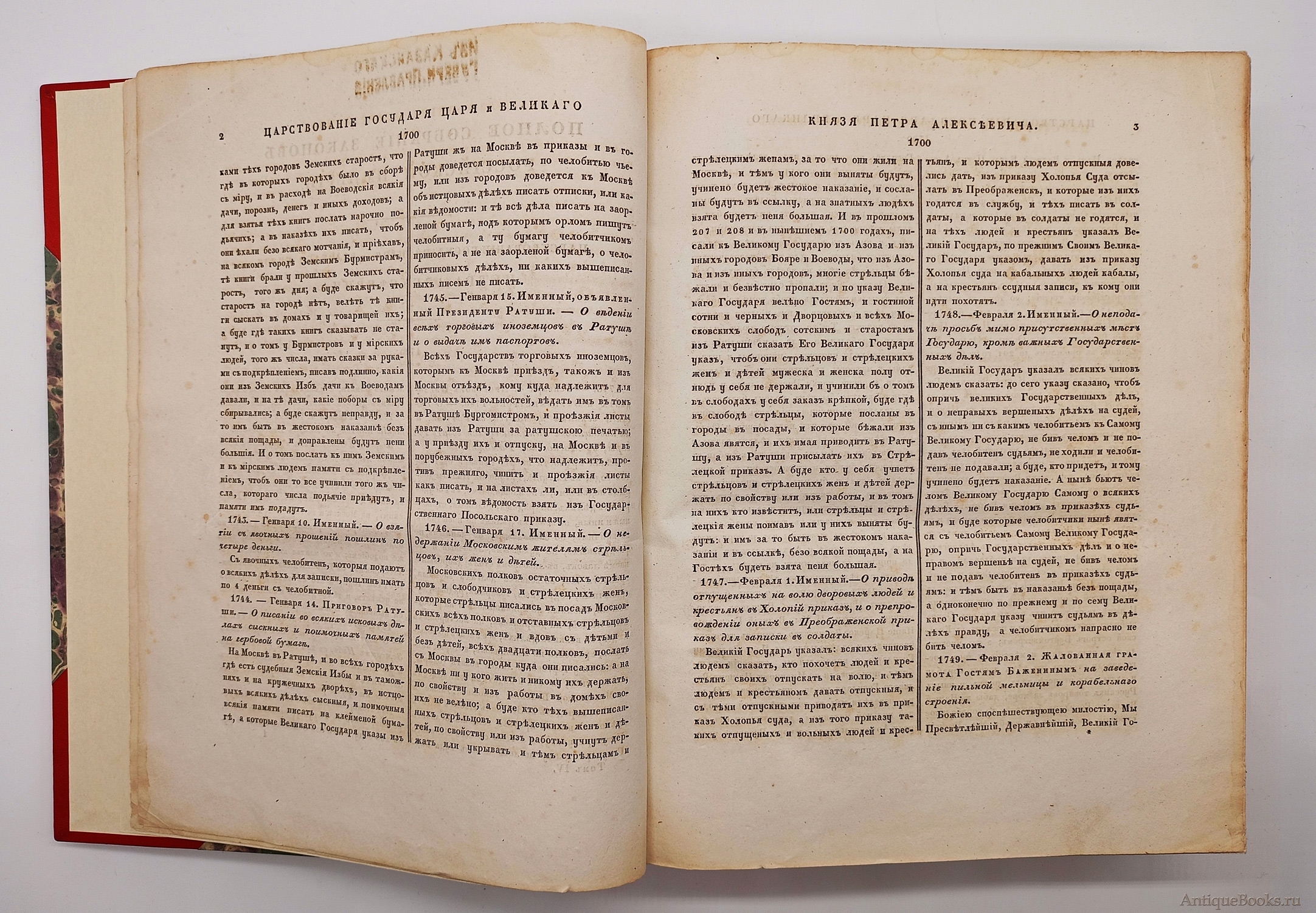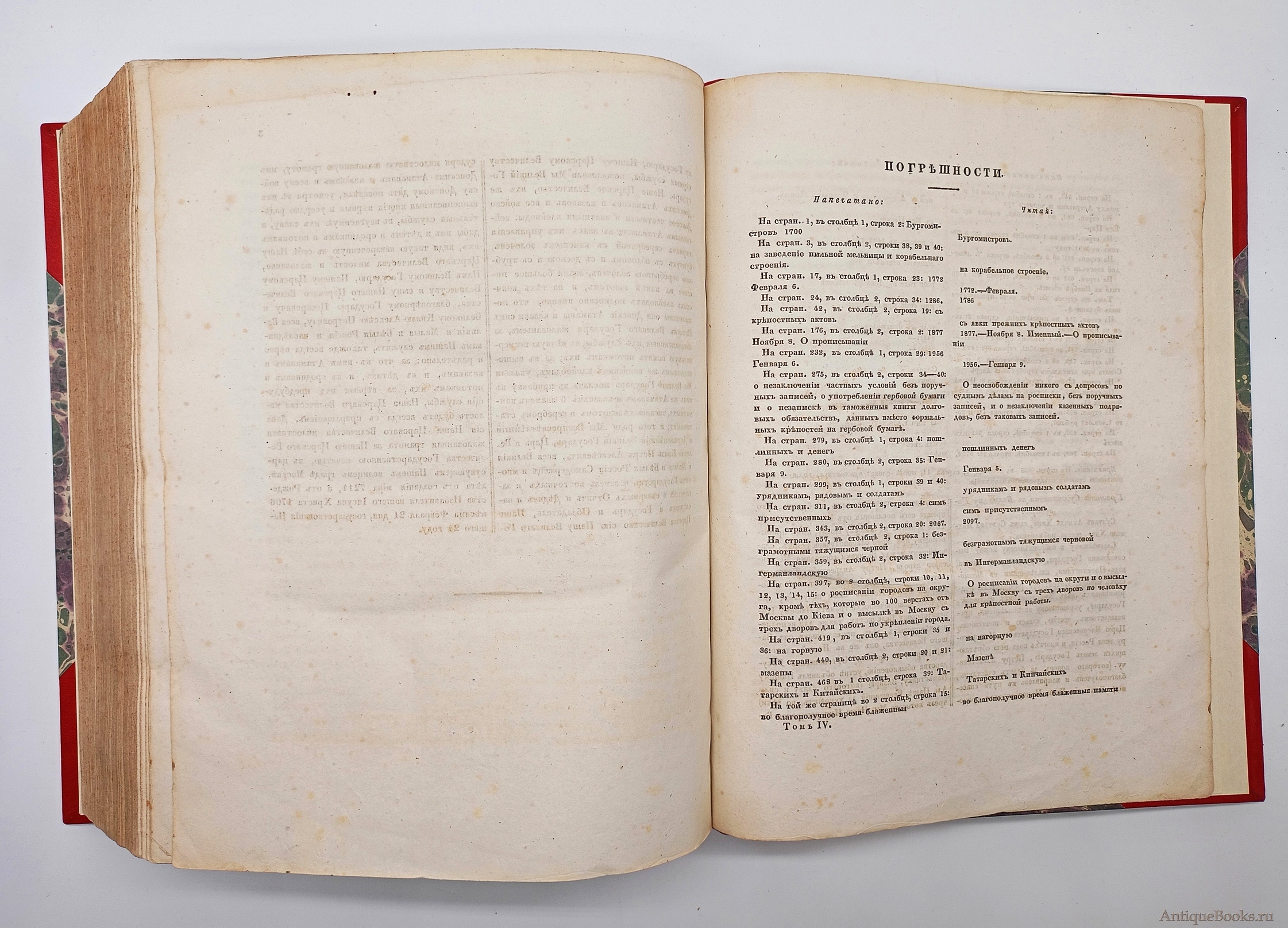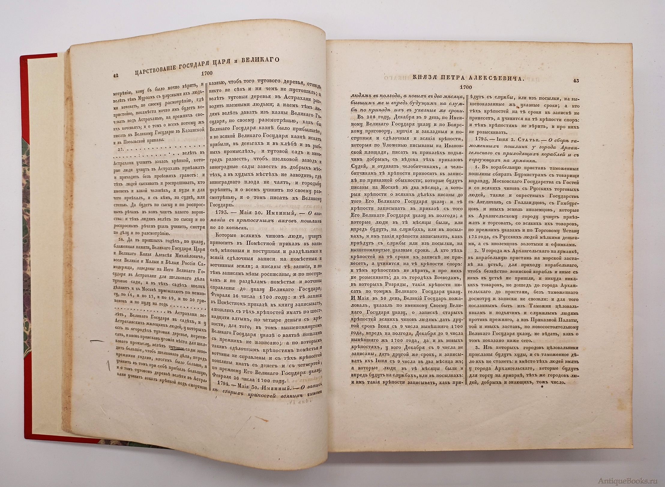Книга в полукожаном переплете. Состояние очень хорошее. Том IV - с 1700 по 1712 г. [1], 881, 7 стр. Полное собрание законов Российской империи (ПСЗ), наиболее полный сборник законодательных актов, расположенных в хронологическом порядке, по номерам утверждения каждого акта царём. Содержит, в частности, законы о порядке заседаний и делопроизводства в Правительствующем Сенате, о вызове иностранцев в Россию и другие. Кодификация законов в России началась во 2-й четверти XIX в. и связана с попытками царизма в условиях кризиса феодально-крепостнического строя и усиления буржуазных отношений укрепить государственный и общественный строй России. Составлением и изданием ПСЗ занимались 2-е отделение собственной его императорского величества канцелярии (1826-1882), Кодификационный отдел Государственного совета (1882-1893) и Отделение свода законов Государственной канцелярии (1893-1917). ПСЗ включало все разновидности законодательных актов дореволюционной России: манифесты, "учреждения", положения, уложения, уставы, рескрипты, "высочайше утвержденные" мнения Государственного совета, журналы Комитета и Совета министров, именные указы и пр. Не включались акты церковного управления (предполагалось издание отдельного "Собрания узаконений" церковного ведомства), а также законодательные акты, касавшиеся императорского двора и придворного ведомства вообще (из-за нежелания огласки). В дореволюционной России было 3 издания ПСЗ. Первое издание 1830 г., составленное под руководством М. М. Сперанского, включает более 30 тысяч законодательных актов с 1649 по 1825 г (45 томов) — время правления Алексея Михайловича — Александра I (33 тома).